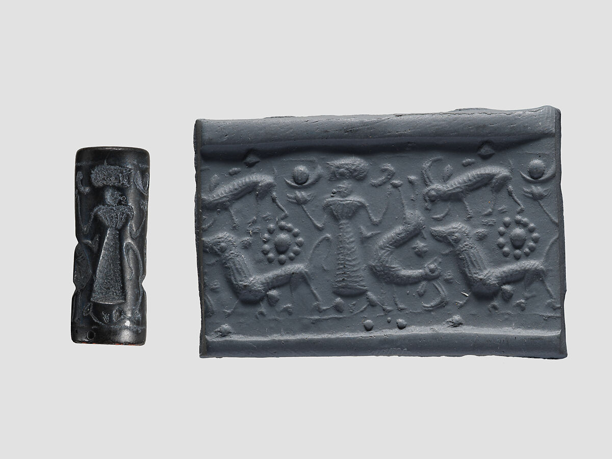 - Title: Cylinder seal and modern impression: female figure, ibex, lion
