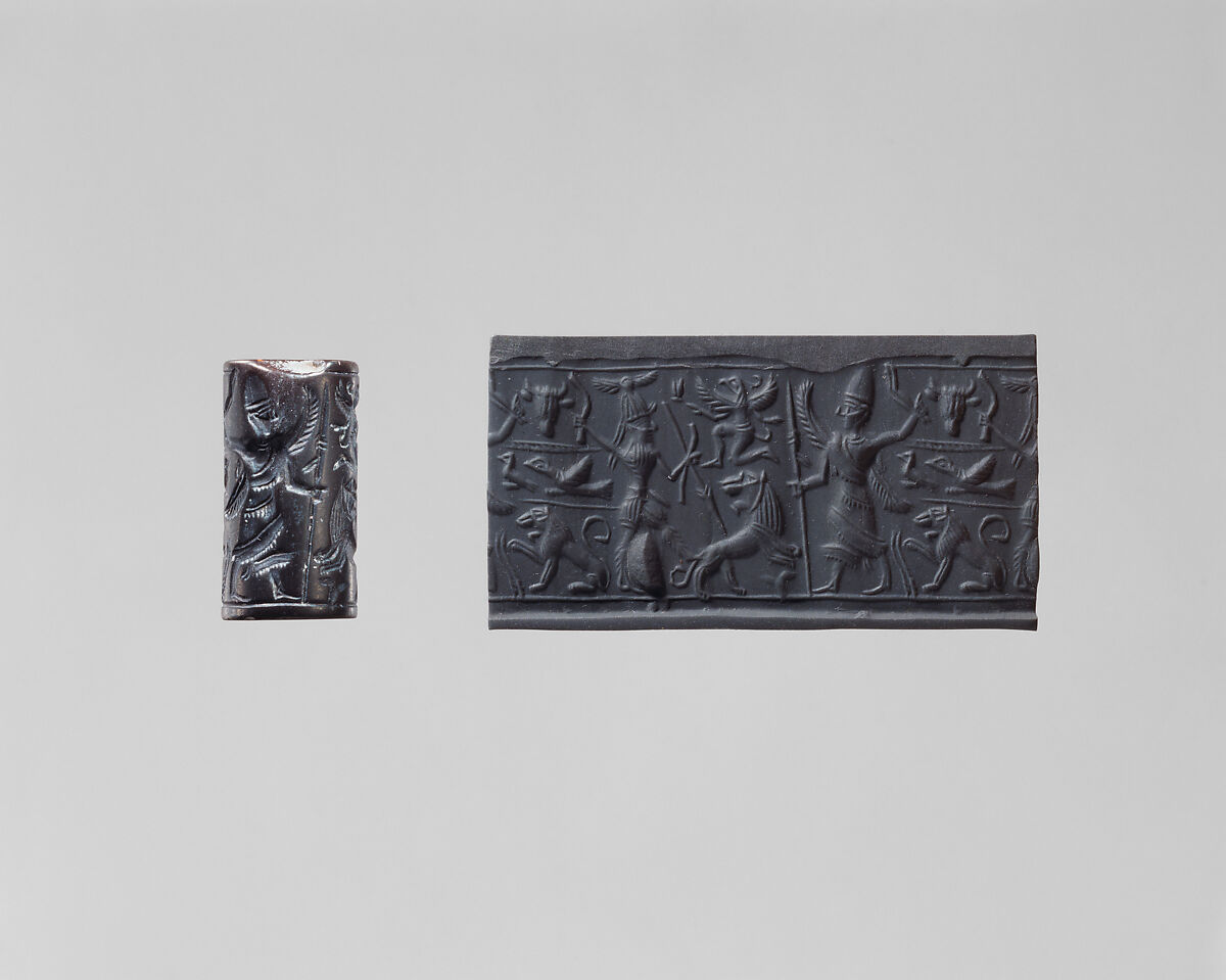 - Title:Cylinder seal and modern impression: hunter spearing a lion before deity with staff