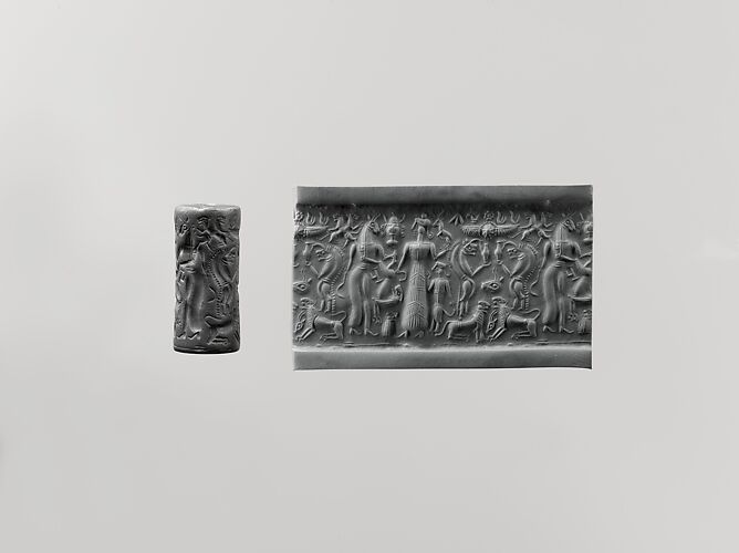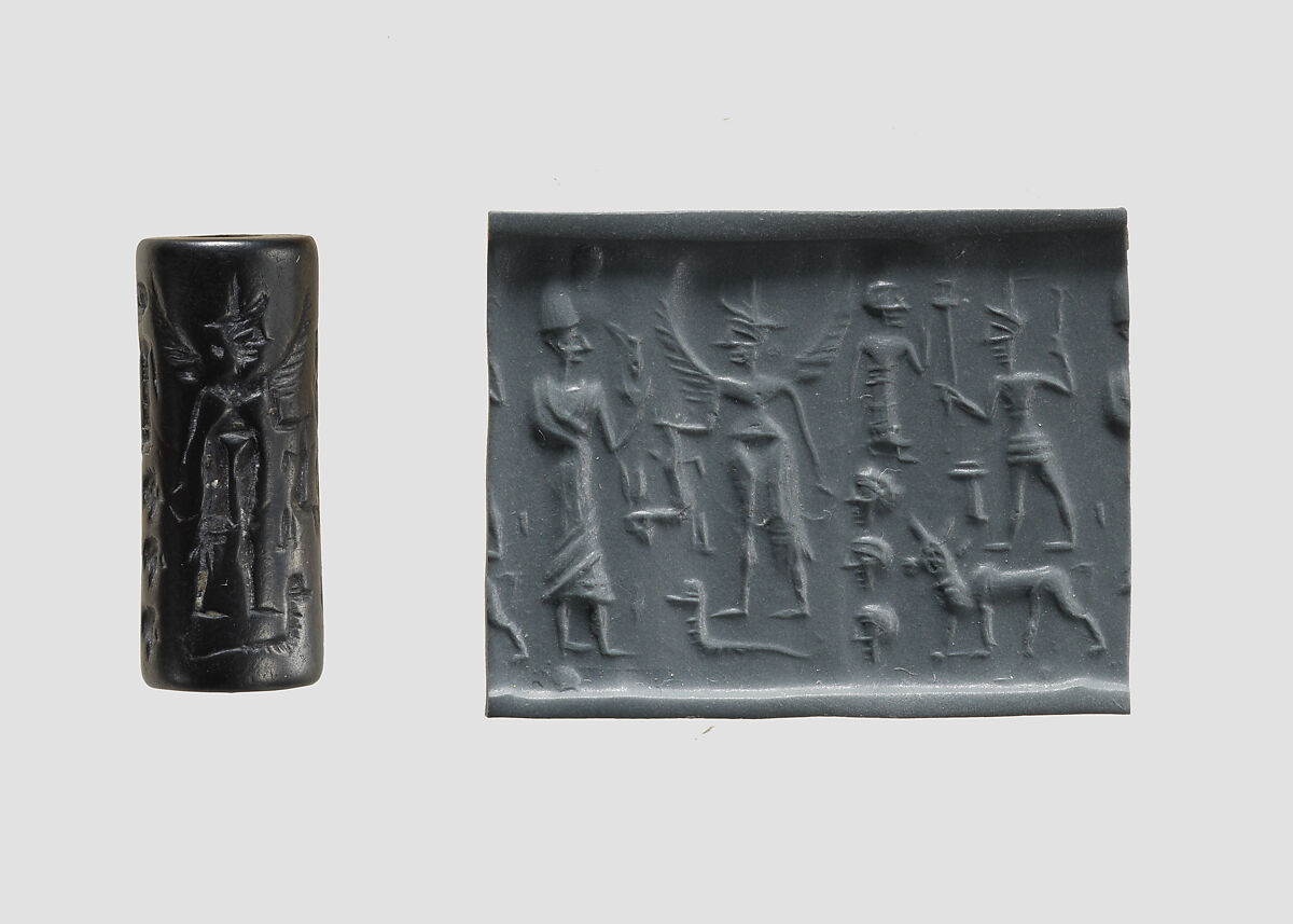 Cylinder seal and modern impression: king before nude winged goddess above snake; weather god on bull