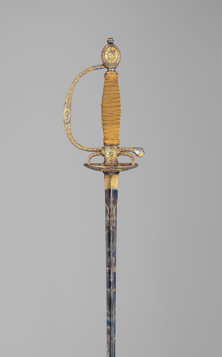 By the early seventeenth century, the rapier, a long slender thrusting sword, began to dominate as the gentleman’s weapon of choice. During the course of the century, however, as civilian fencing techniques became more specialized and refined, the rapier developed into a lighter, trimmed-down weapon known by about 1700 as the smallsword. Smallswords, often richly decorated, remained an integral part of a gentleman’s wardrobe until the wearing of swords in civilian settings went out of fashion at the end of the eighteenth century, at which time pistols were replacing swords as arms most frequently used in personal duels. The majority of smallsword hilts are made of silver or steel, but many also employ a wide variety of luxurious materials, such as gold, porcelain, and enamel. At their best, smallswords combine the crafts of swordsmith, cutler, and jeweler to create an elegant weapon that was also a wearable work of art.