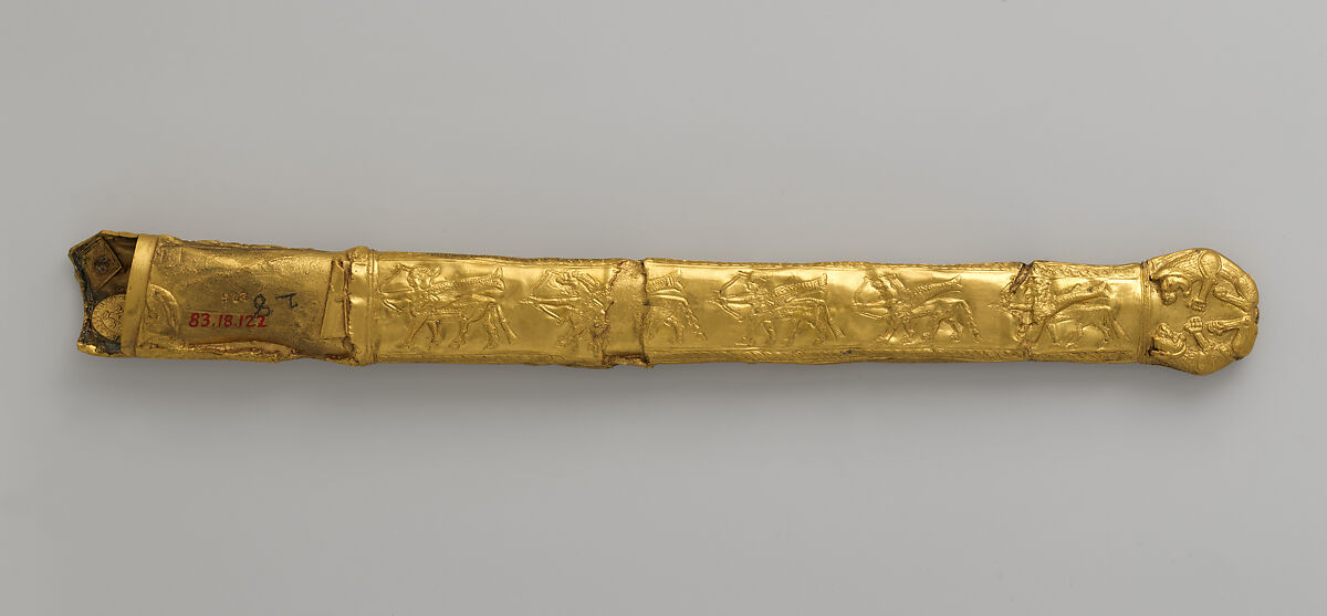 This modern electrotype is a copy of a gold sheath in the Hermitage Museum, St Petersburg. The original, known as the Melgunov scabbard, was found with its iron sword in the first kurgan excavated in the Dniepr region in 1763 by General Alexey Melgunov (1722-1788). The rich burial, dated to the late seventh to early sixth century B.C., notably yielded objects showing influence from Urartu, such as the decoration of fantastic creatures on the sheath. At the time of the excavations the Scythians were unknown to scholars and therefore the significance of the discoveries was not recognized.