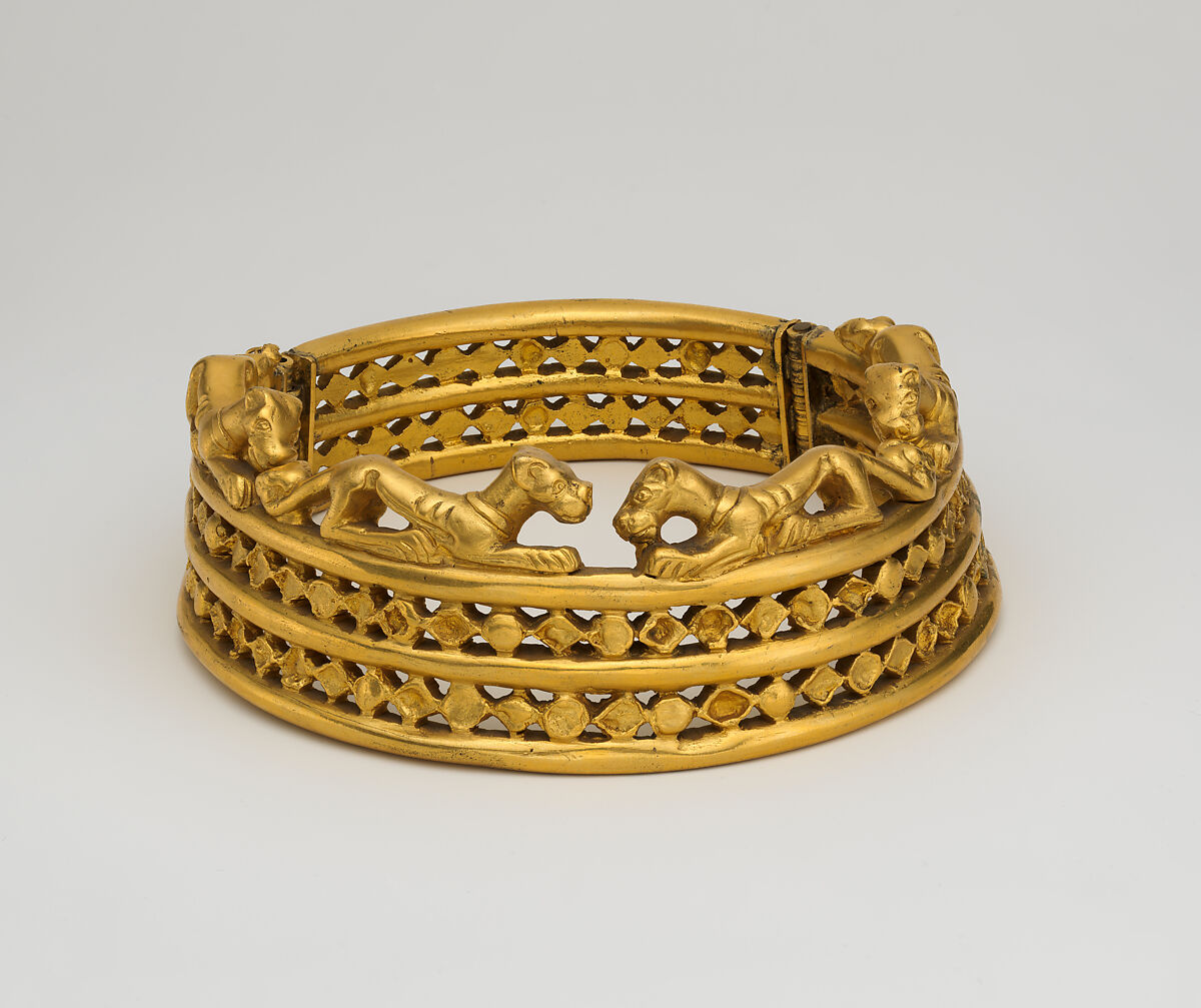 This modern electrotype is a copy of a gold collar in the Hermitage Museum, St. Petersburg. The original was found in 1864 in the Khokhlach kurgan (burial mound) in the vicinity of Novocherkassk, one of the largest cities of the Don region. It was part of a group of precious objects – a crown, collars, ornaments, cups, flacons or perfume-boxes – known as the “Treasure of Novocherkassk” and thought to be the burial of an elite Sarmatian woman in the first century A.D. Sarmatian objects are decorated with animal imagery comparable to the earlier Scythian “animal style” and frequently enhanced with colored inlays. The hinged collar is three rings, joined by a band of lozenges and disks originally set with turquoise. On the upper edge are two pairs of lions facing each other.