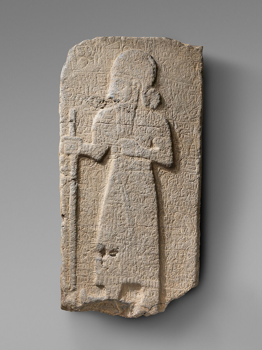 This stele depicts a bearded male figure facing left, surrounded by a shallowly incised inscription divided into seven lines. The figure is shown with attributes characteristic of ruling elites, including the long, fringed garment, the staff he holds in his right hand, his rounded headdress, and his hairstyle, in which the hair is gathered at the nape of the neck in a bunch. The surface of the stele is worn and details are no longer visible in many areas, including the face. The feet are damaged, but the upturned toes of the figure’s shoes can still be seen.