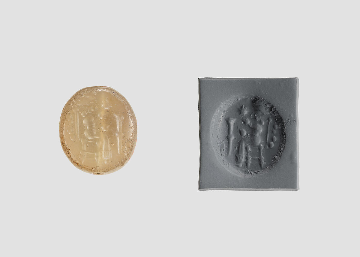 - Title:Stamp seal (scaraboid) with deity and divine symbols