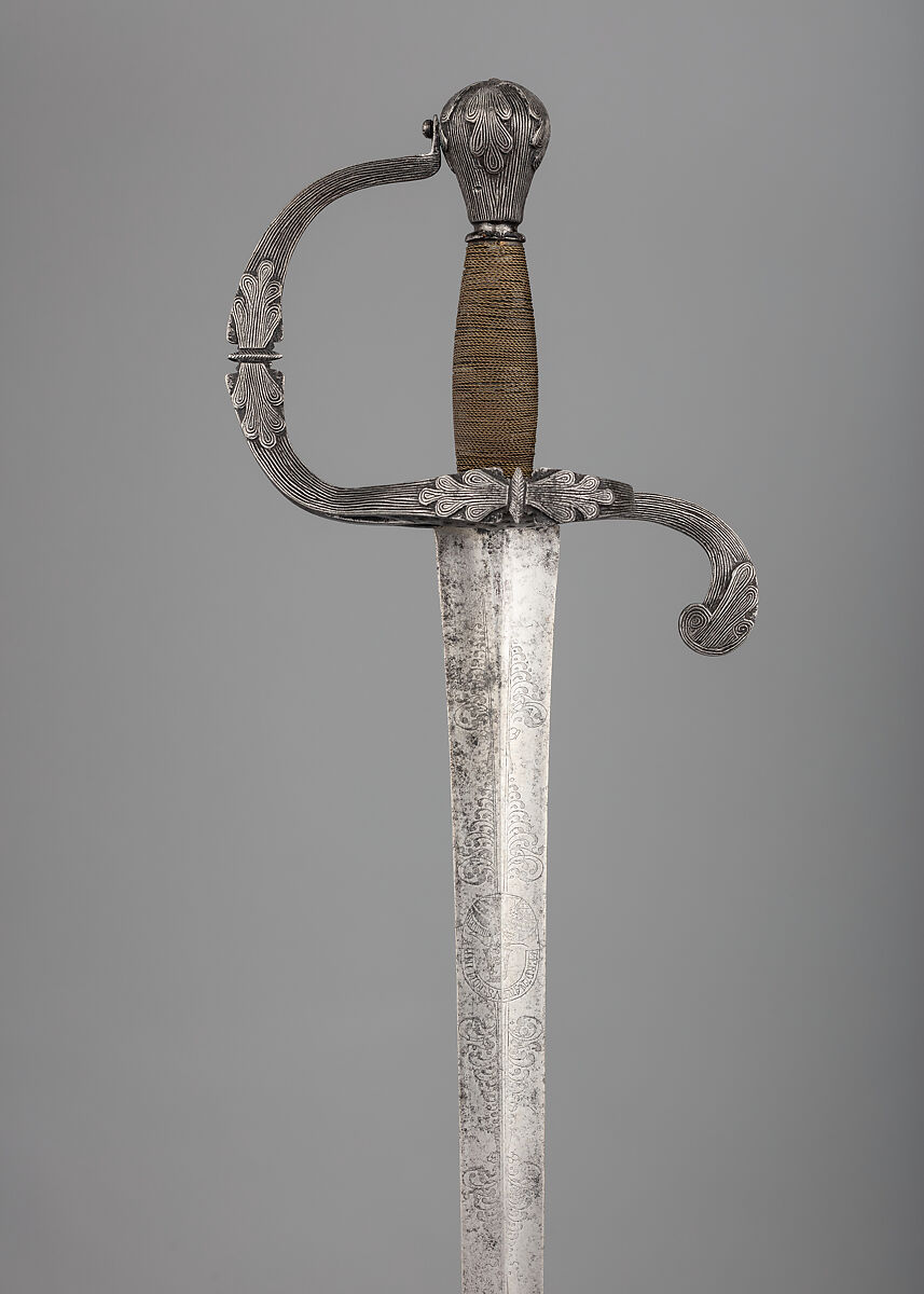 The rapier was the principal civilian sidearm throughout the sixteenth and seventeenth centuries. Designed for cut-and-thrust fencing of progressively complex techniques, the rapier is characterized by a double-edged blade with an acute point and an elaborate guard for the hand. The guards, usually of iron or steel, were subject to a variety of embellishment. They were engraved, chiseled, gilded, damascened, and encrusted in gold and silver in keeping with fashionable styles.