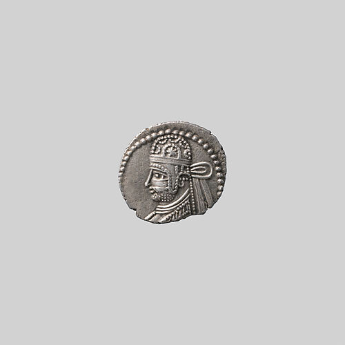 This coin was struck by the Parthian king Osroes (reigned ca. A.D. 110-129?). The king on the obverse is probably meant to be Osroes himself, wearing a diadem as a symbol of victory. The identity of the figure on the reverse is unknown; perhaps it is an idealized Parthian king, depicted as an archer. The figure of the archer is quite stylized, in contrast to earlier Parthian coins where it is more closely modeled on the image of Apollo that appears on early Seleucid coins. The head of the king on the obverse also exhibits some stylization, such as in the schematic rendering of the eye and beard. It seems that sometime during the first century A.D. the Parthians rejected Seleucid stylistic models altogether, in favor of this more schematic rendering.