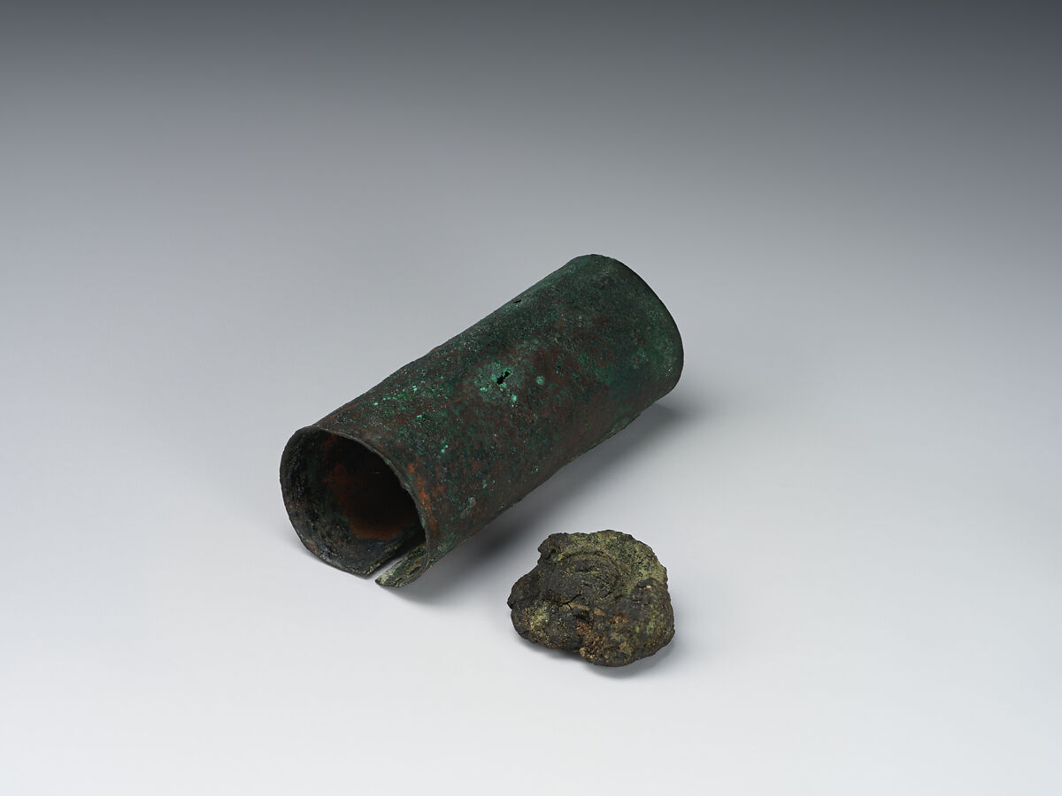 A group of ten amulet cases (32.150.95, 32.150.96, 32.150.97, 32.150.98, 32.150.99, 32.150.100, 32.150.101, 32.150.102, 32.150.103, 32.150.104) were found inside a plain unglazed jar (32.150.94). The cases are made from sheet copper rolled into cylinders and the ends stopped with bitumen. Although only one fragment of papyrus was found, the texts probably contained exorcisms or blessings.