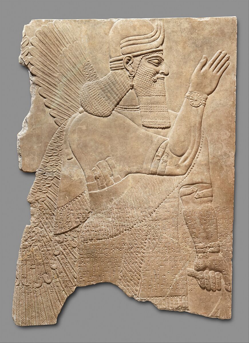 This panel from the Northwest Palace at Nimrud (ancient Kalhu) depicts a winged supernatural figure. Such figures appear throughout the palace, sometimes flanking either the figure of the Assyrian king or a stylized "sacred tree." The reliefs were painted, but today almost none of the original pigment survives. However, the reliefs themselves retain incredible detail, including intricate incised designs on many of the figures’ clothing.