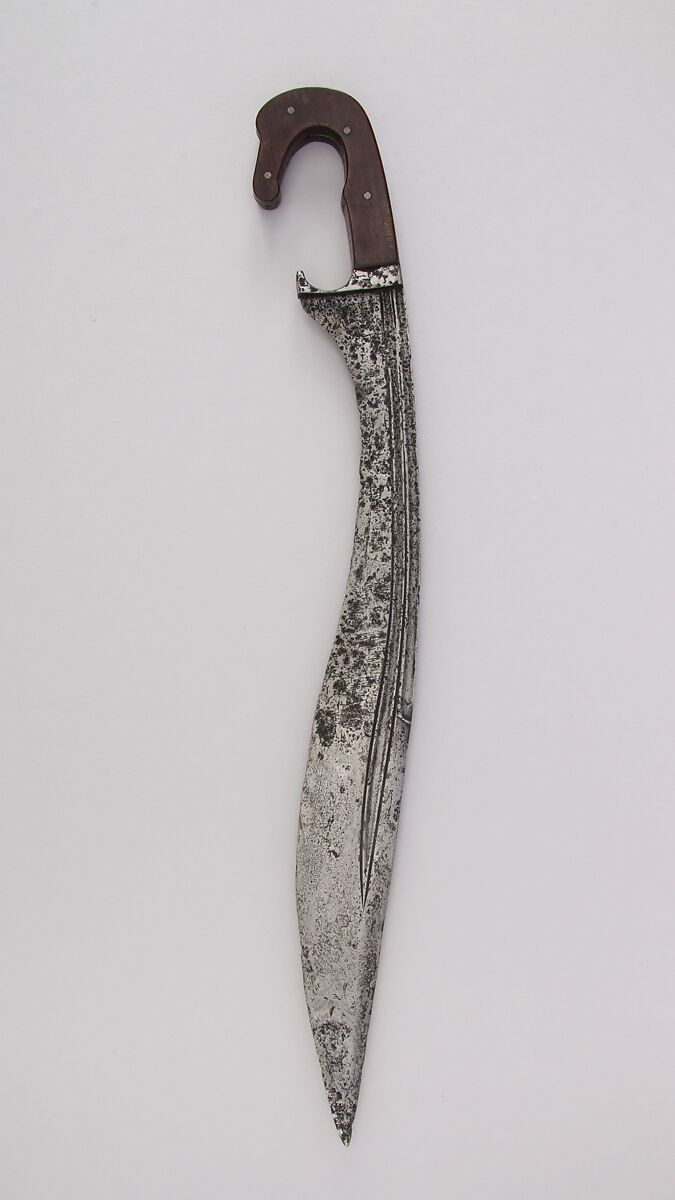 Although its old patina was removed and an inaccurate modern wood grip was added sometime before it was acquired, The Metropolitan Museum's falcata occupies an important place among the examples known to survive because of the otherwise fine state of preservation of its blade, which is structurally intact and only superficially corroded.