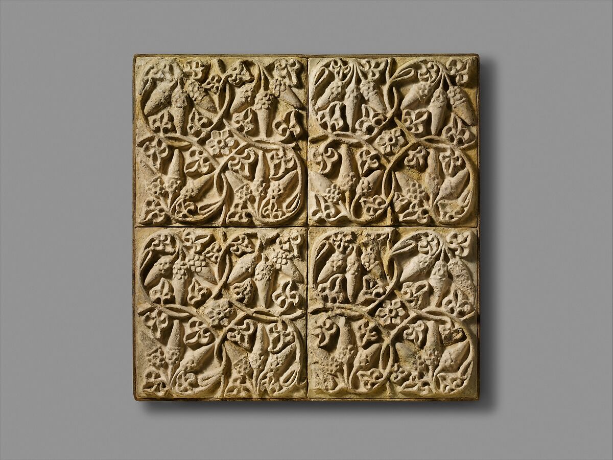 Stucco reliefs were commonly used to decorate elite Sasanian houses like these examples from Ma’aridh VI in the Ctesiphon area. These four tiles (MMA 32.150.5, 32.150.6, 32.150.7, 32.150.8), found in the remains of a vaulted reception room, or iwan, formed part of a larger wall covering. Because only one mold was needed to create the tiles, the intricate vine motif could be repeated endlessly and still be quite complex. The reconstruction suggests the effect of such panels in their original setting.