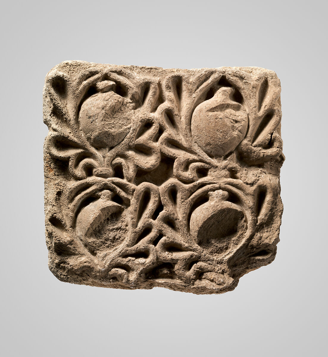 Stucco reliefs were commonly used to decorate the iwans and reception halls of elite Sasanian houses. Many examples were found in excavated houses in the Ctesiphon area including this fragment from Tell Dheheb consisting of a repeating pomegranate in palmette design. The use of molds to make stuccos allowed for the creation of large scale repetitive patterns such as geometric and vegetal motifs.