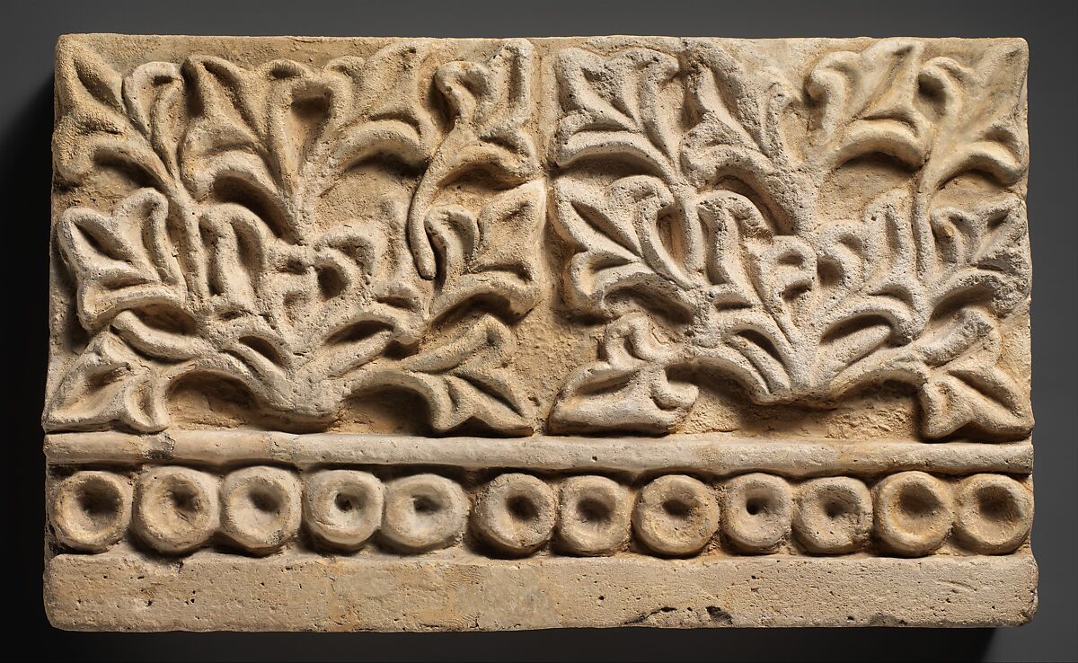 Stucco reliefs were commonly used to decorate the iwans and reception halls of elite Sasanian houses. Many examples were found in excavated houses in the Ctesiphon area including this relief from Ma’aridh IV consisting of two stylized plants above a beaded border. The use of molds to make stuccos allowed for the creation of large scale repetitive patterns such as floral and vegetal motifs. This pattern was also found in the nearby house of Ma’aridh VI, indicating the reuse of the molds to create stuccos for different buildings.