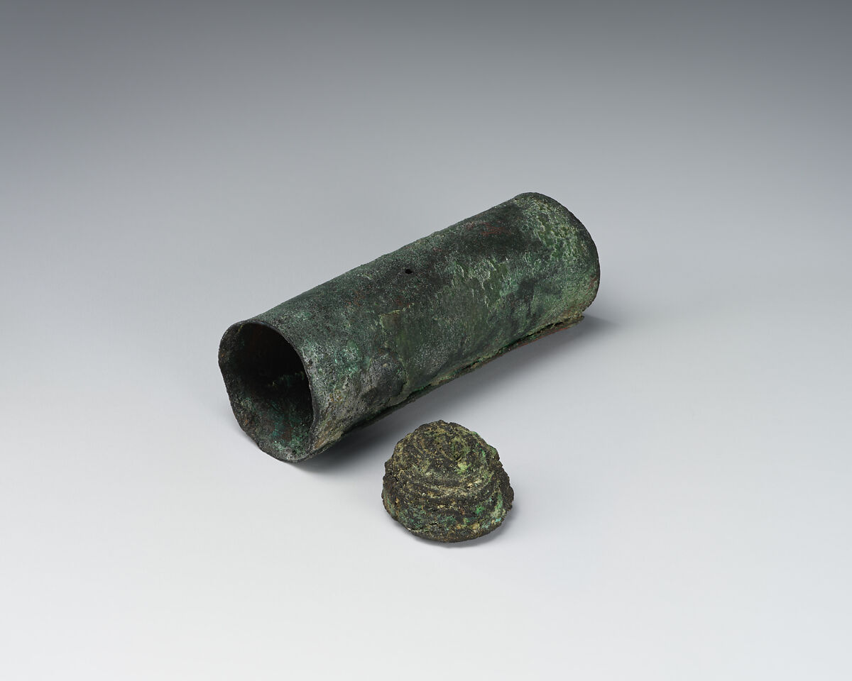 A group of ten amulet cases (32.150.95, 32.150.96, 32.150.97, 32.150.98, 32.150.99, 32.150.100, 32.150.101, 32.150.102, 32.150.103, 32.150.104) were found inside a plain unglazed jar (32.150.94). The cases are made from sheet copper rolled into cylinders and the ends stopped with bitumen. Although only one fragment of papyrus was found, the texts probably contained exorcisms or blessings.