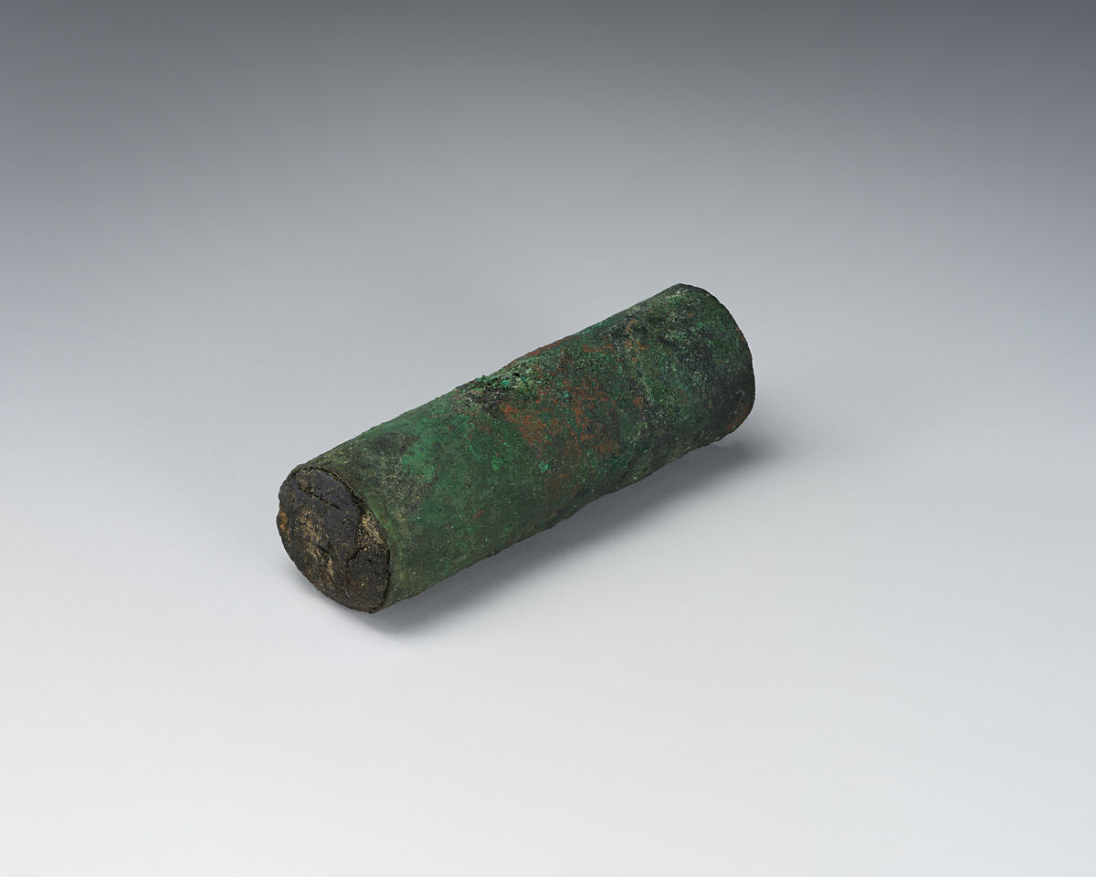 A group of ten amulet cases (32.150.95, 32.150.96, 32.150.97, 32.150.98, 32.150.99, 32.150.100, 32.150.101, 32.150.102, 32.150.103, 32.150.104) were found inside a plain unglazed jar (32.150.94). The cases are made from sheet copper rolled into cylinders and the ends stopped with bitumen. Although only one fragment of papyrus was found, the texts probably contained exorcisms or blessings.