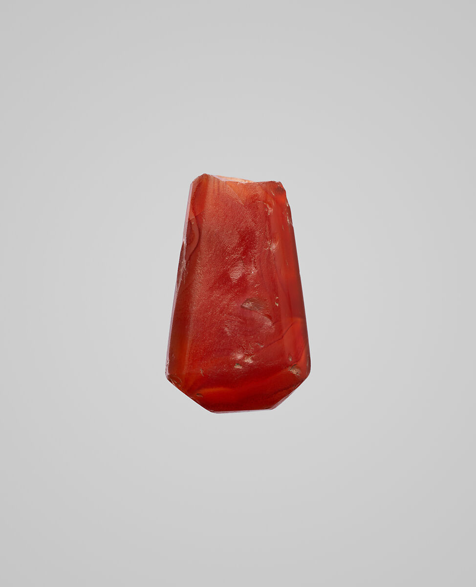 This small broken fragment of carnelian was probably originally a pendant. The portion of the pendant with the hole is no longer preserved. This fragment was excavated from a house at Ma’aridh I in the Ctesiphon area. The presence of semi-precious stones like carnelian indicate the wealth of the household.