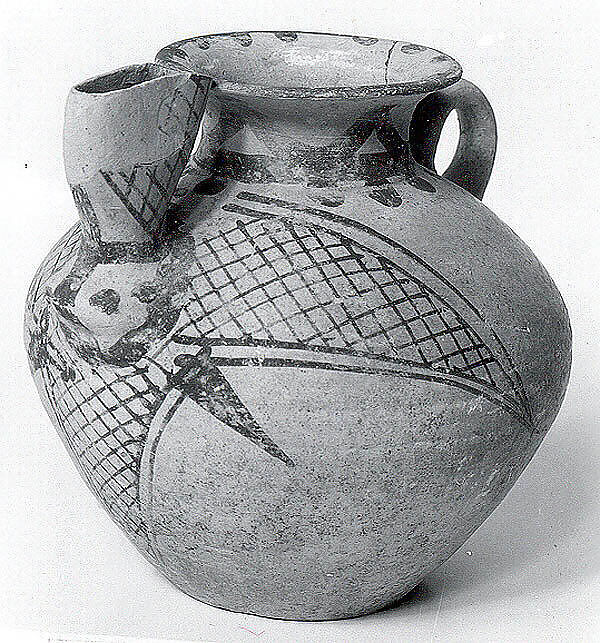 This pitcher is very similar to those excavated at Tepe Sialk, near Kashan in central Iran. Sialk was the site of a fortified town, constructed in the early first millennium B.C. Several hundred yards from the town there was a large cemetery, called Necropolis B by the archaeologists who explored it between 1933 and 1937. The graves were pits covered with pitched roofs made of stone or clay, and in addition to the bodies of the dead they contained jewelry, weapons, leather armor, horse trappings and ceramic vessels, including many similar pitchers. Presumably this pitcher was used to pour a liquid containing dregs, such as wine, since the round body and spout would prevent the dregs from ending up in the cup. Possibly it was used in a funerary banquet or ritual before it was placed in the grave; regardless, its burial in the cemetery shows that drinking wine was an important part of life and death in Iron Age Sialk.