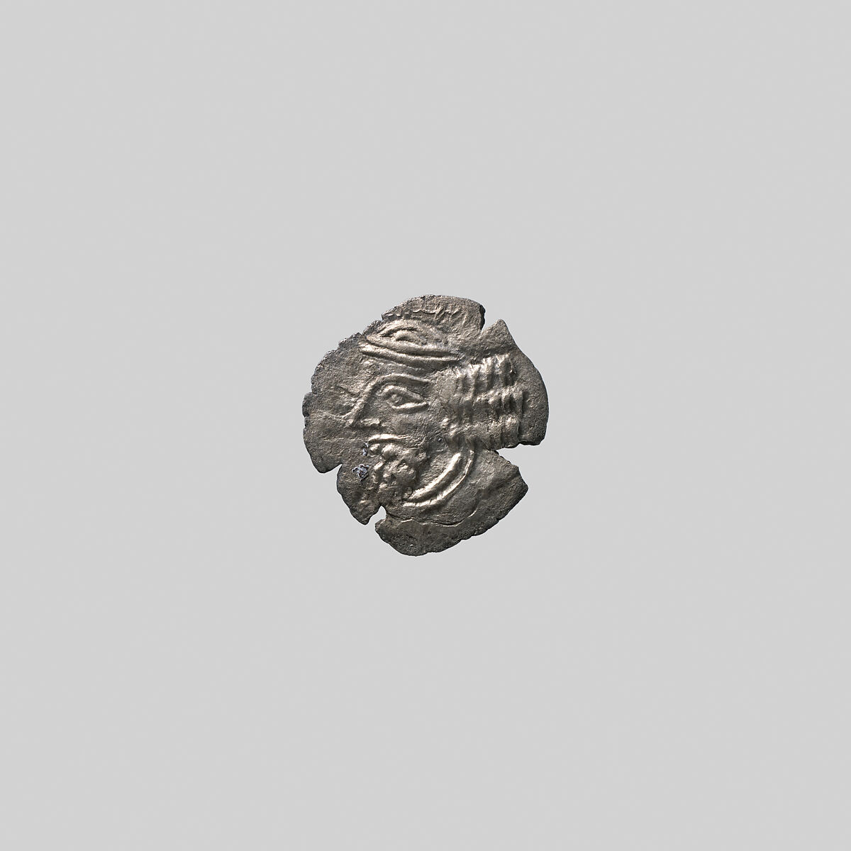 On the obverse of this small silver coin, a bust of the king faces to the left. He has a long, curly beard, long hair and a large nose, and wears a domed hat (called a ‘tiara’) with a diadem (the headband worn by victorious athletes in ancient Greece) tied over it. He also wears a necklace or torque around his neck. The reverse type is all but impossible to discern.