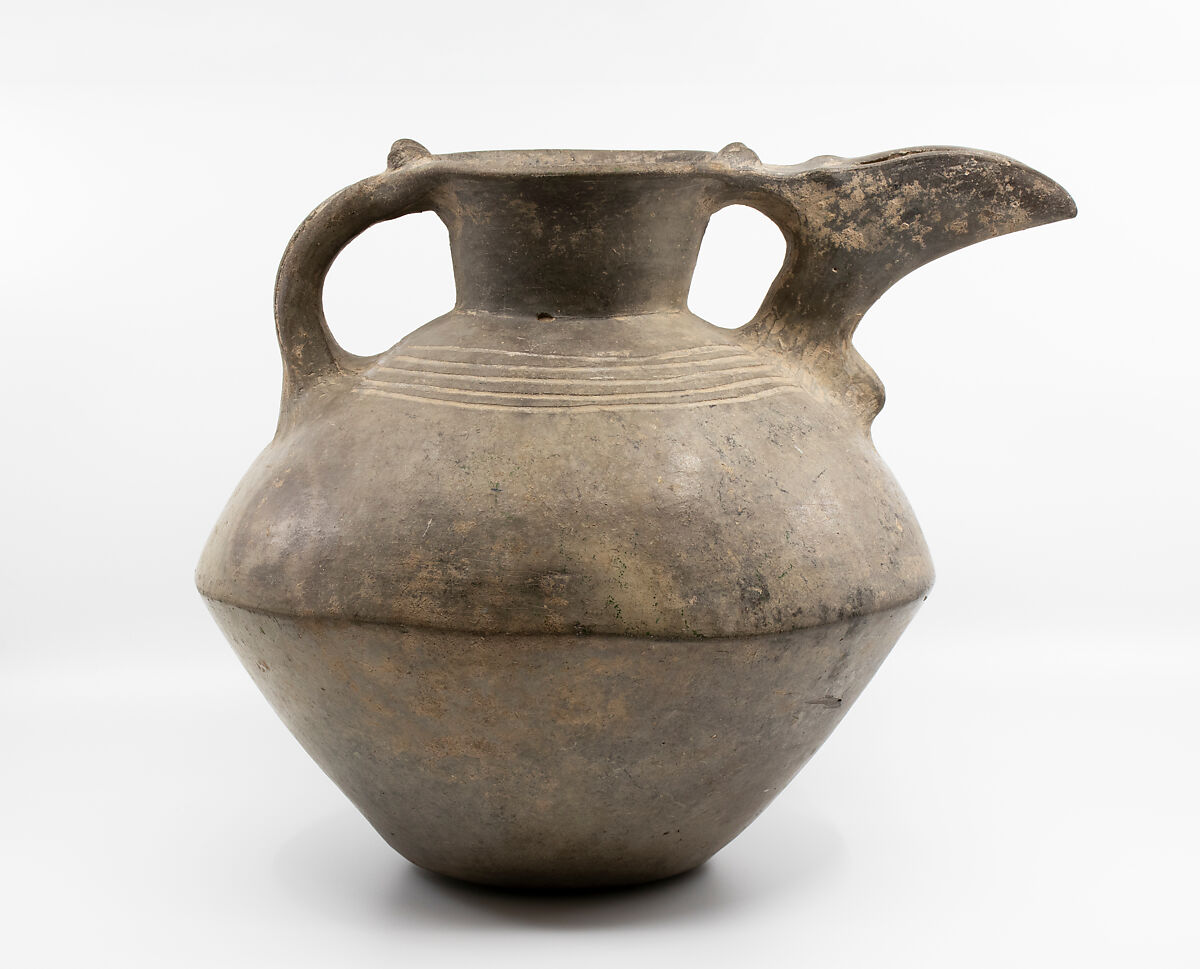 This large pitcher has a biconical body with a flat base and a high neck. The two conical halves of the pitcher form a sharp ridge where the meet at the middle of the body. A thick handle connects the rim to the body; opposite it a pointed spout rises from the pitcher’s shoulder. The spout is attached to the rim by a small bridge, and both the bridge and the handle have raised lumps, perhaps in imitation of metal rivers, where they join the rim. Five incised lines decorate the upper part of the body. The pitcher is made of burnished grey clay. It was made on a potter’s wheel in two pieces, with the spout and handle added later.