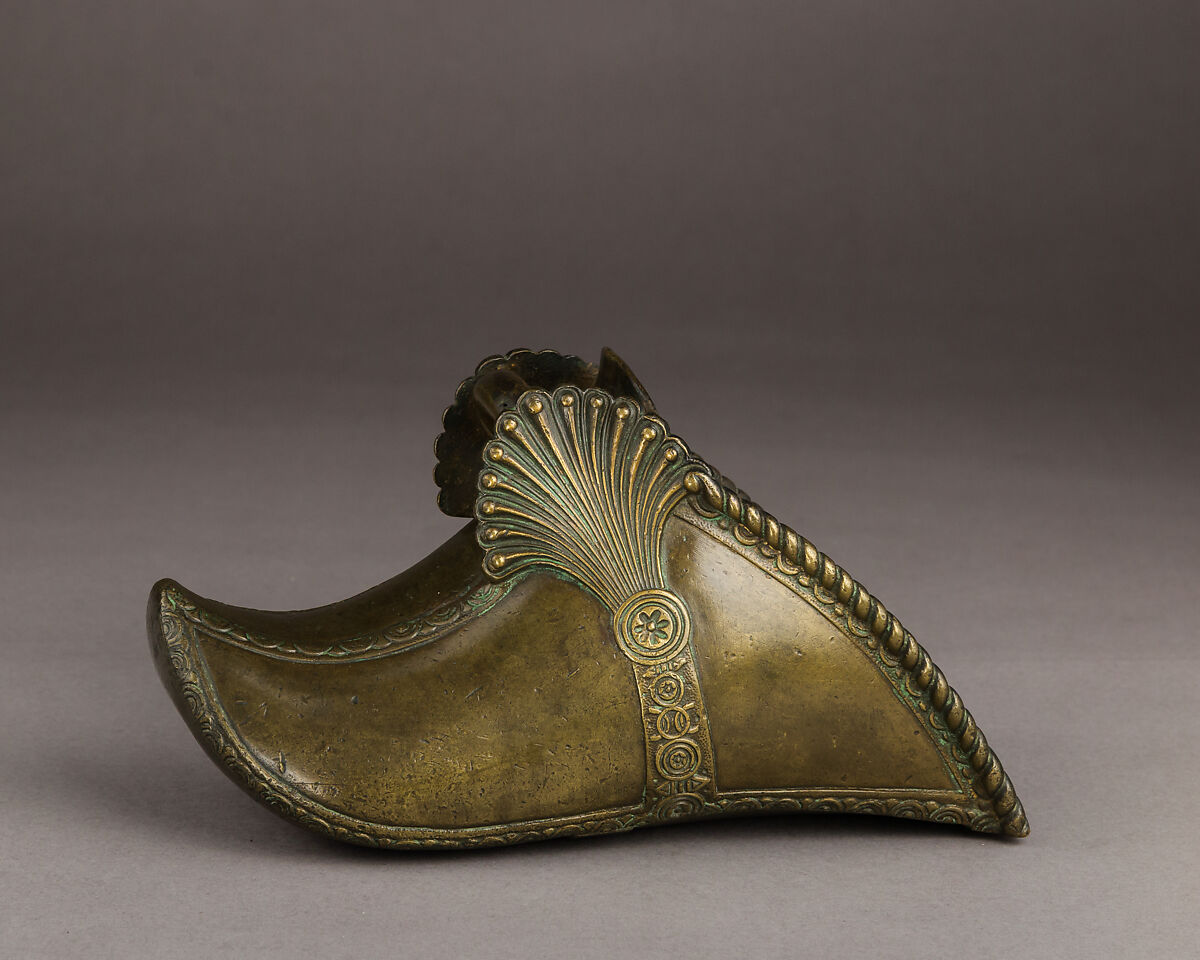 This slipper stirrup, cast in bronze, mimics in metal the shape and decoration of a traditional leather boot. The rope design on the edge copies the sewing of the inside leather lining found on some other examples. The high quality of the metal casting is a direct inheritance of the metalworking skills displayed by Peruvian native populations before Spanish conquest.