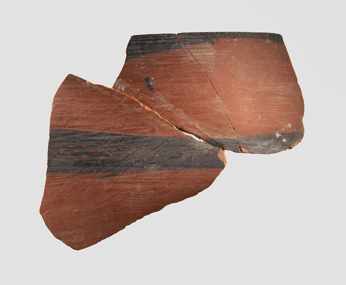 This sherd is made of a pale red clay, with black painted decoration. It is typical of Namazga I ceramics from Turkmenistan, dating to ca. 4000-3500 B.C. It was excavated in 1937 at a prehistoric site in the vicinity of Nishapur in northeastern Iran. While Nishapur itself was founded by the Sasanian king Shapur I (reigned ca. A.D. 241-272), this sherd shows that human habitation there goes back to the prehistoric period. Furthermore, the prehistoric pottery from Nishapur has close affinities with ceramic materials from Central Asia rather than with contemporary sites in Iran, meaning that in this period its inhabitants were likely culturally linked to their neighbors to the east. At the same time, Nishapur’s location on what later became known as the Great Khorasan Road suggests that it was part of the trade network that facilitated the import of precious stones such as lapis lazuli, carnelian and turquoise from Central Asia to Mesopotamia.