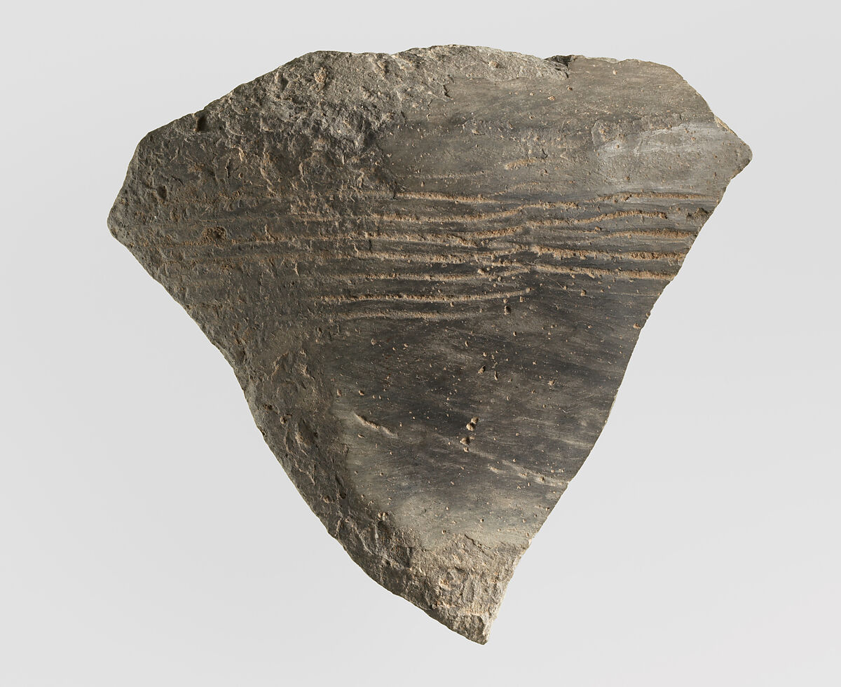 This sherd is made of grey burnished clay. It is typical of Namazga IV ceramics from Turkmenistan and Hissar II ceramics from Iran, and likely date to ca. 3100-2500 B.C. It was excavated in 1937 at a prehistoric site in the vicinity of Nishapur in northeastern Iran. While Nishapur itself was founded by the Sasanian king Shapur I (reigned ca. A.D. 241-272), this sherd shows that human habitation there goes back to the prehistoric period. Furthermore, the prehistoric pottery from Nishapur has close affinities with ceramic materials from Central Asia rather than with contemporary sites in Iran, meaning that in this period its inhabitants were likely culturally linked to their neighbors to the east. At the same time, Nishapur’s location on what later became known as the Great Khorasan Road suggests that it was part of the trade network that facilitated the import of precious stones such as lapis lazuli, carnelian and turquoise from Central Asia to Mesopotamia.