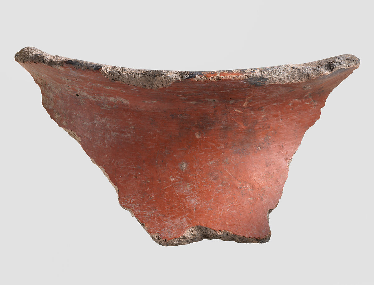 This sherd is made of grey clay which has been painted red on the outside and black on the inside, and the exterior surface has been polished. It is typical of Namazga IV ceramics from Turkmenistan and Hissar II ceramics from Iran, and likely date to ca. 3100-2500 B.C. It was excavated in 1937 at a prehistoric site in the vicinity of Nishapur in northeastern Iran. While Nishapur itself was founded by the Sasanian king Shapur I (reigned ca. A.D. 241-272), this sherd shows that human habitation there goes back to the prehistoric period. Furthermore, the prehistoric pottery from Nishapur has close affinities with ceramic materials from Central Asia rather than with contemporary sites in Iran, meaning that in this period its inhabitants were likely culturally linked to their neighbors to the east. At the same time, Nishapur’s location on what later became known as the Great Khorasan Road suggests that it was part of the trade network that facilitated the import of precious stones such as lapis lazuli, carnelian and turquoise from Central Asia to Mesopotamia.