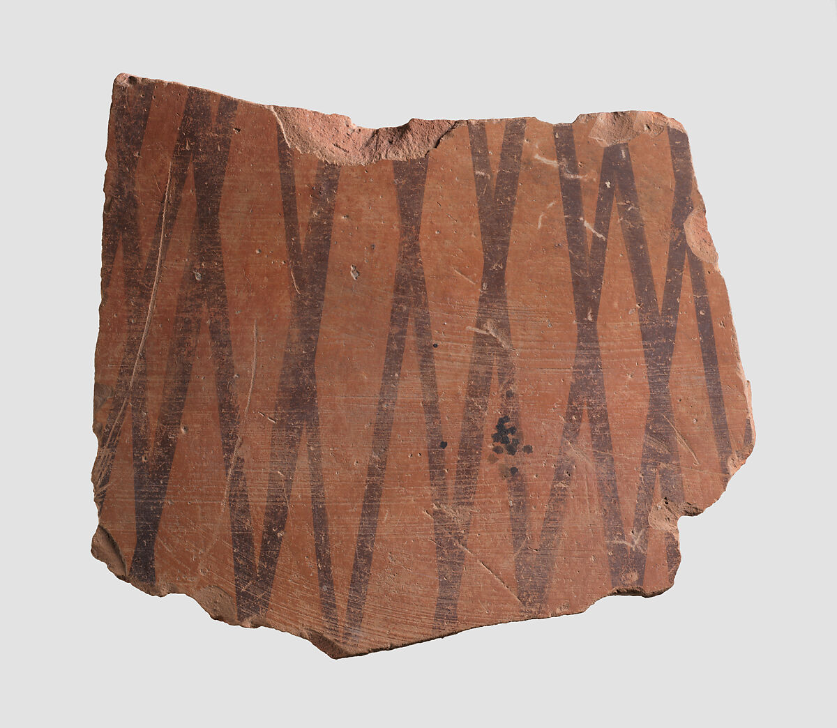 This sherd is made of a red clay, with black painted decoration. It is typical of Namazga II ceramics from Turkmenistan, dating to ca. 3500-3100 B.C. It was excavated in 1937 at a prehistoric site in the vicinity of Nishapur in northeastern Iran. While Nishapur itself was founded by the Sasanian king Shapur I (reigned ca. A.D. 241-272), this sherd shows that human habitation there goes back to the prehistoric period. Furthermore, the prehistoric pottery from Nishapur has close affinities with ceramic materials from Central Asia rather than with contemporary sites in Iran, meaning that in this period its inhabitants were likely culturally linked to their neighbors to the east. At the same time, Nishapur’s location on what later became known as the Great Khorasan Road suggests that it was part of the trade network that facilitated the import of precious stones such as lapis lazuli, carnelian and turquoise from Central Asia to Mesopotamia.
