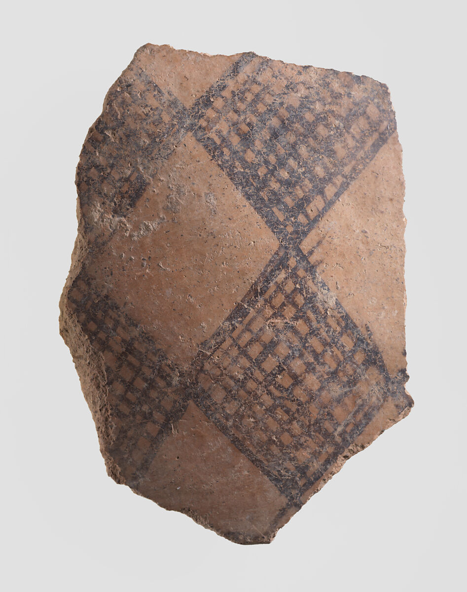 This sherd is made of a red clay, with brown painted decoration. It is typical of Yaz I ceramics from Turkmenistan, dating to ca. 1500-1000 B.C. It was excavated in 1937 at a prehistoric site in the vicinity of Nishapur in northeastern Iran. While Nishapur itself was founded by the Sasanian king Shapur I (reigned ca. A.D. 241-272), this sherd shows that human habitation there goes back to the prehistoric period. Furthermore, the prehistoric pottery from Nishapur has close affinities with ceramic materials from Central Asia rather than with contemporary sites in Iran, meaning that in this period its inhabitants were likely culturally linked to their neighbors to the east. At the same time, Nishapur’s location on what later became known as the Great Khorasan Road suggests that it was part of the trade network that facilitated the import of precious stones such as lapis lazuli, carnelian and turquoise from Central Asia to Mesopotamia.