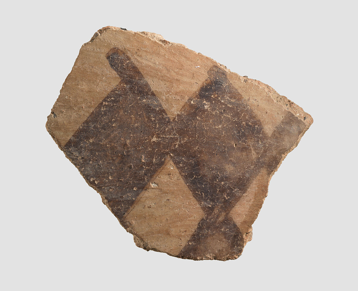 This sherd is made of a red clay, with brown painted decoration. It is typical of Yaz I ceramics from Turkmenistan, dating to ca. 1500-1000 B.C. It was excavated in 1937 at a prehistoric site in the vicinity of Nishapur in northeastern Iran. While Nishapur itself was founded by the Sasanian king Shapur I (reigned ca. A.D. 241-272), this sherd shows that human habitation there goes back to the prehistoric period. Furthermore, the prehistoric pottery from Nishapur has close affinities with ceramic materials from Central Asia rather than with contemporary sites in Iran, meaning that in this period its inhabitants were likely culturally linked to their neighbors to the east. At the same time, Nishapur’s location on what later became known as the Great Khorasan Road suggests that it was part of the trade network that facilitated the import of precious stones such as lapis lazuli, carnelian and turquoise from Central Asia to Mesopotamia.