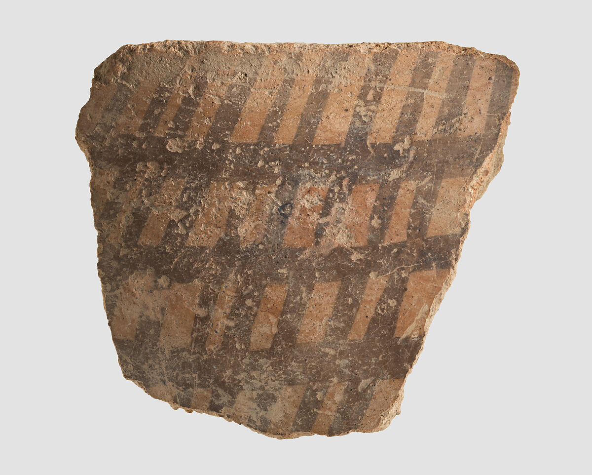 This sherd is made of a red clay, with purple painted decoration. It is typical of Yaz I ceramics from Turkmenistan, dating to ca. 1500-1000 B.C. It was excavated in 1937 at a prehistoric site in the vicinity of Nishapur in northeastern Iran. While Nishapur itself was founded by the Sasanian king Shapur I (reigned ca. A.D. 241-272), this sherd shows that human habitation there goes back to the prehistoric period. Furthermore, the prehistoric pottery from Nishapur has close affinities with ceramic materials from Central Asia rather than with contemporary sites in Iran, meaning that in this period its inhabitants were likely culturally linked to their neighbors to the east. At the same time, Nishapur’s location on what later became known as the Great Khorasan Road suggests that it was part of the trade network that facilitated the import of precious stones such as lapis lazuli, carnelian and turquoise from Central Asia to Mesopotamia.