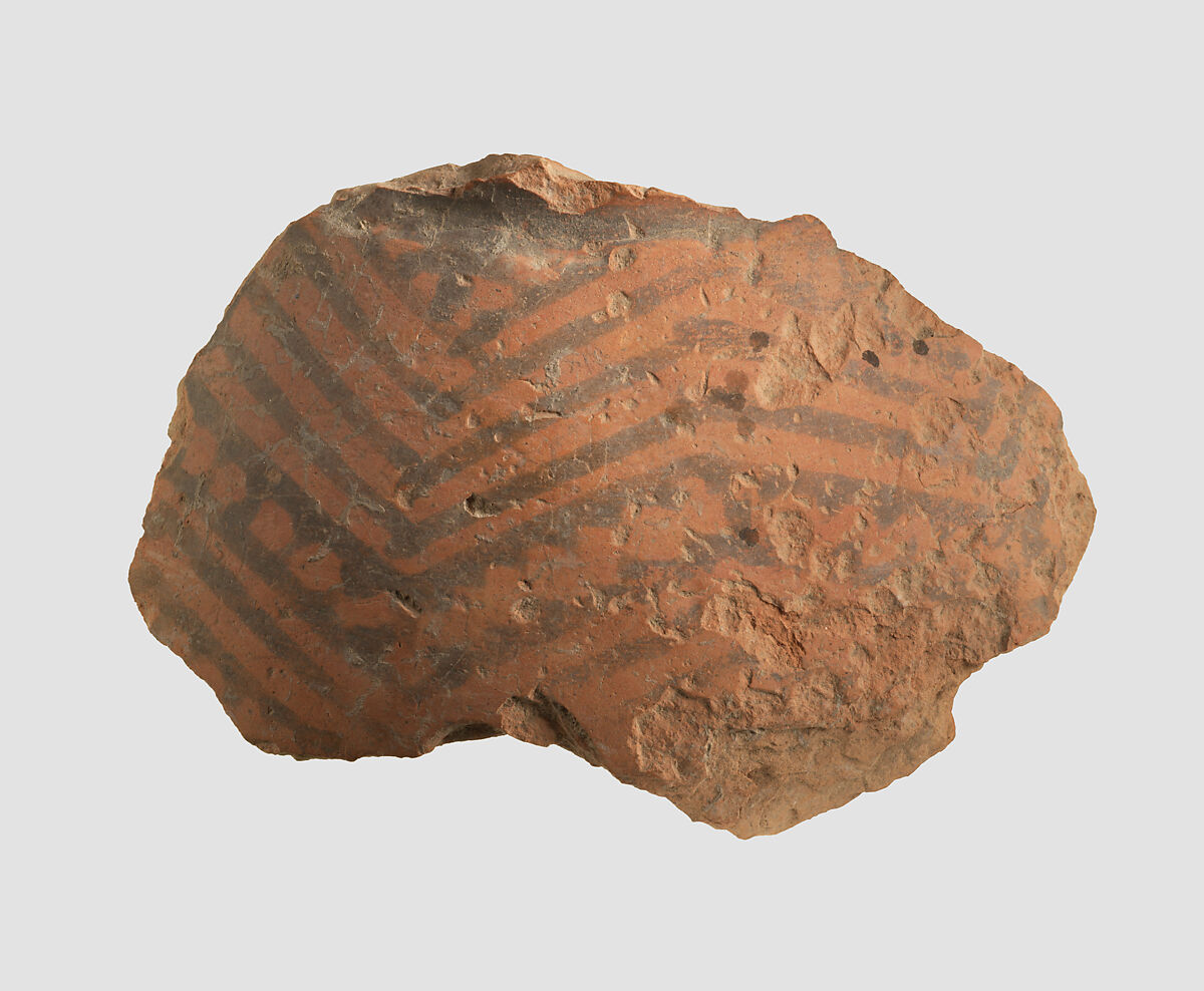 This sherd is made of a red clay, with purple painted decoration. It is typical of Namazga III ceramics from Turkmenistan, dating to ca. 3100-2700 B.C. It was excavated in 1937 at a prehistoric site in the vicinity of Nishapur in northeastern Iran. While Nishapur itself was founded by the Sasanian king Shapur I (reigned ca. A.D. 241-272), this sherd shows that human habitation there goes back to the prehistoric period. Furthermore, the prehistoric pottery from Nishapur has close affinities with ceramic materials from Central Asia rather than with contemporary sites in Iran, meaning that in this period its inhabitants were likely culturally linked to their neighbors to the east. At the same time, Nishapur’s location on what later became known as the Great Khorasan Road suggests that it was part of the trade network that facilitated the import of precious stones such as lapis lazuli, carnelian and turquoise from Central Asia to Mesopotamia.