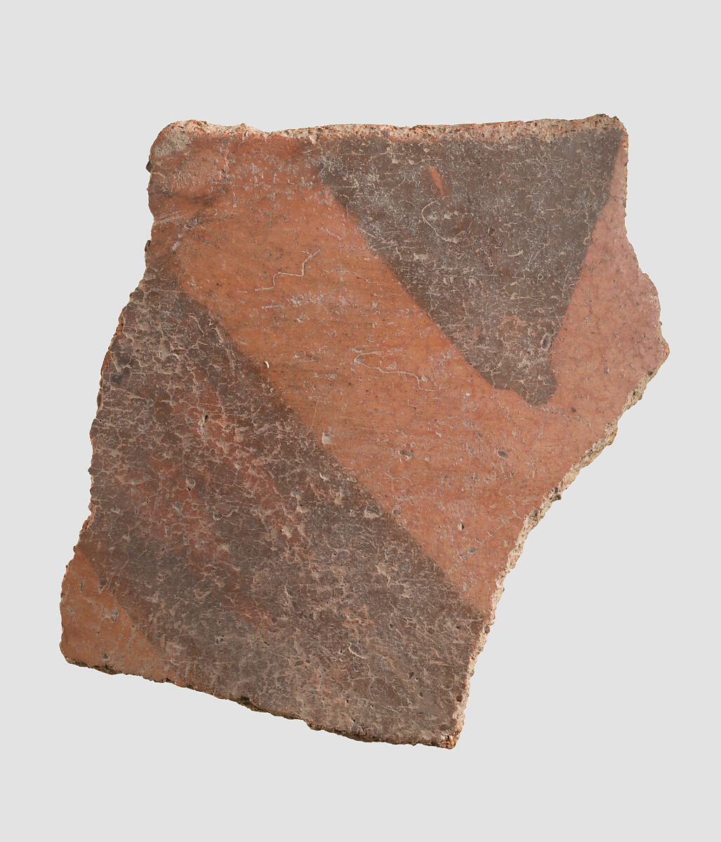 This sherd is made of a pink-buff clay, with brown and red painted decoration. It is typical of Namazga III ceramics from Turkmenistan, dating to ca. 3100-2700 B.C. It was excavated in 1937 at a prehistoric site in the vicinity of Nishapur in northeastern Iran. While Nishapur itself was founded by the Sasanian king Shapur I (reigned ca. A.D. 241-272), this sherd shows that human habitation there goes back to the prehistoric period. Furthermore, the prehistoric pottery from Nishapur has close affinities with ceramic materials from Central Asia rather than with contemporary sites in Iran, meaning that in this period its inhabitants were likely culturally linked to their neighbors to the east. At the same time, Nishapur’s location on what later became known as the Great Khorasan Road suggests that it was part of the trade network that facilitated the import of precious stones such as lapis lazuli, carnelian and turquoise from Central Asia to Mesopotamia.