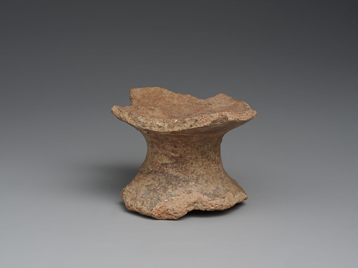 This sherd is from a goblet or bowl on a short foot. It is made of red clay. It was excavated in 1937 at a prehistoric site in the vicinity of Nishapur in northeastern Iran. While Nishapur itself was founded by the Sasanian king Shapur I (reigned ca. A.D. 241-272), this sherd shows that human habitation there goes back to the prehistoric period. Furthermore, the prehistoric pottery from Nishapur has close affinities with ceramic materials from Central Asia rather than with contemporary sites in Iran, meaning that in this period its inhabitants were likely culturally linked to their neighbors to the east. At the same time, Nishapur’s location on what later became known as the Great Khorasan Road suggests that it was part of the trade network that facilitated the import of precious stones such as lapis lazuli, carnelian and turquoise from Central Asia to Mesopotamia.
