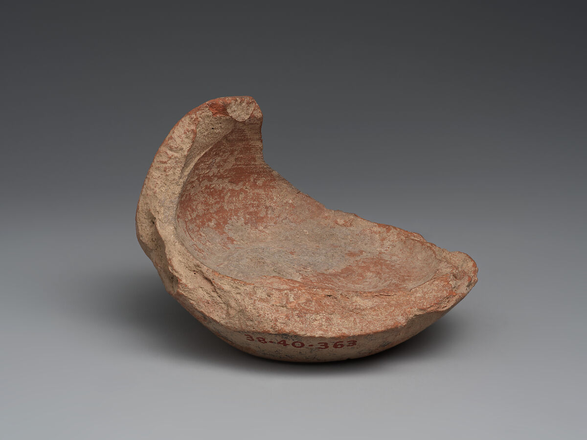 This sherd is made of a red clay, with black painted decoration. It was excavated in 1937 at a prehistoric site in the vicinity of Nishapur in northeastern Iran. While Nishapur itself was founded by the Sasanian king Shapur I (reigned ca. A.D. 241-272), this object shows that human habitation there goes back to the prehistoric period. Furthermore, the prehistoric pottery from Nishapur has close affinities with ceramic materials from Central Asia rather than with contemporary sites in Iran, meaning that in this period its inhabitants were likely culturally linked to their neighbors to the east. At the same time, Nishapur’s location on what later became known as the Great Khorasan Road suggests that it was part of the trade network that facilitated the import of precious stones such as lapis lazuli, carnelian and turquoise from Central Asia to Mesopotamia.