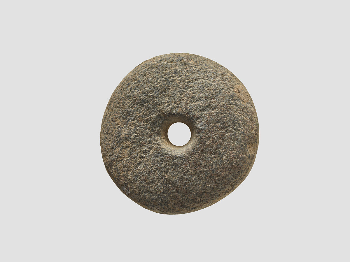 This stone spindle whorl was excavated in 1937 at a prehistoric site in the vicinity of Nishapur in northeastern Iran. While Nishapur itself was founded by the Sasanian king Shapur I (reigned ca. A.D. 241-272), this whorl shows that human habitation there goes back to the prehistoric period. Furthermore, the prehistoric pottery from Nishapur has close affinities with ceramic materials from Central Asia rather than with contemporary sites in Iran, meaning that in this period its inhabitants were likely culturally linked to their neighbors to the east. At the same time, Nishapur’s location on what later became known as the Great Khorasan Road suggests that it was part of the trade network that facilitated the import of precious stones such as lapis lazuli, carnelian and turquoise from Central Asia to Mesopotamia.
