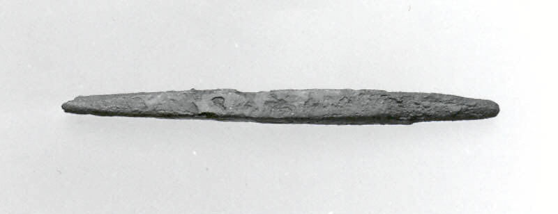 This copper awl was excavated in 1937 at a prehistoric site in the vicinity of Nishapur in northeastern Iran. While Nishapur itself was founded by the Sasanian king Shapur I (reigned ca. A.D. 241-272), this awl shows that human habitation there goes back to the prehistoric period. Furthermore, the prehistoric pottery from Nishapur has close affinities with ceramic materials from Central Asia rather than with contemporary sites in Iran, meaning that in this period its inhabitants were likely culturally linked to their neighbors to the east. At the same time, Nishapur’s location on what later became known as the Great Khorasan Road suggests that it was part of the trade network that facilitated the import of precious stones such as lapis lazuli, carnelian and turquoise from Central Asia to Mesopotamia.