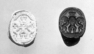 - Title: Scarab seal with Bes dominating two lions below a winged sun disc