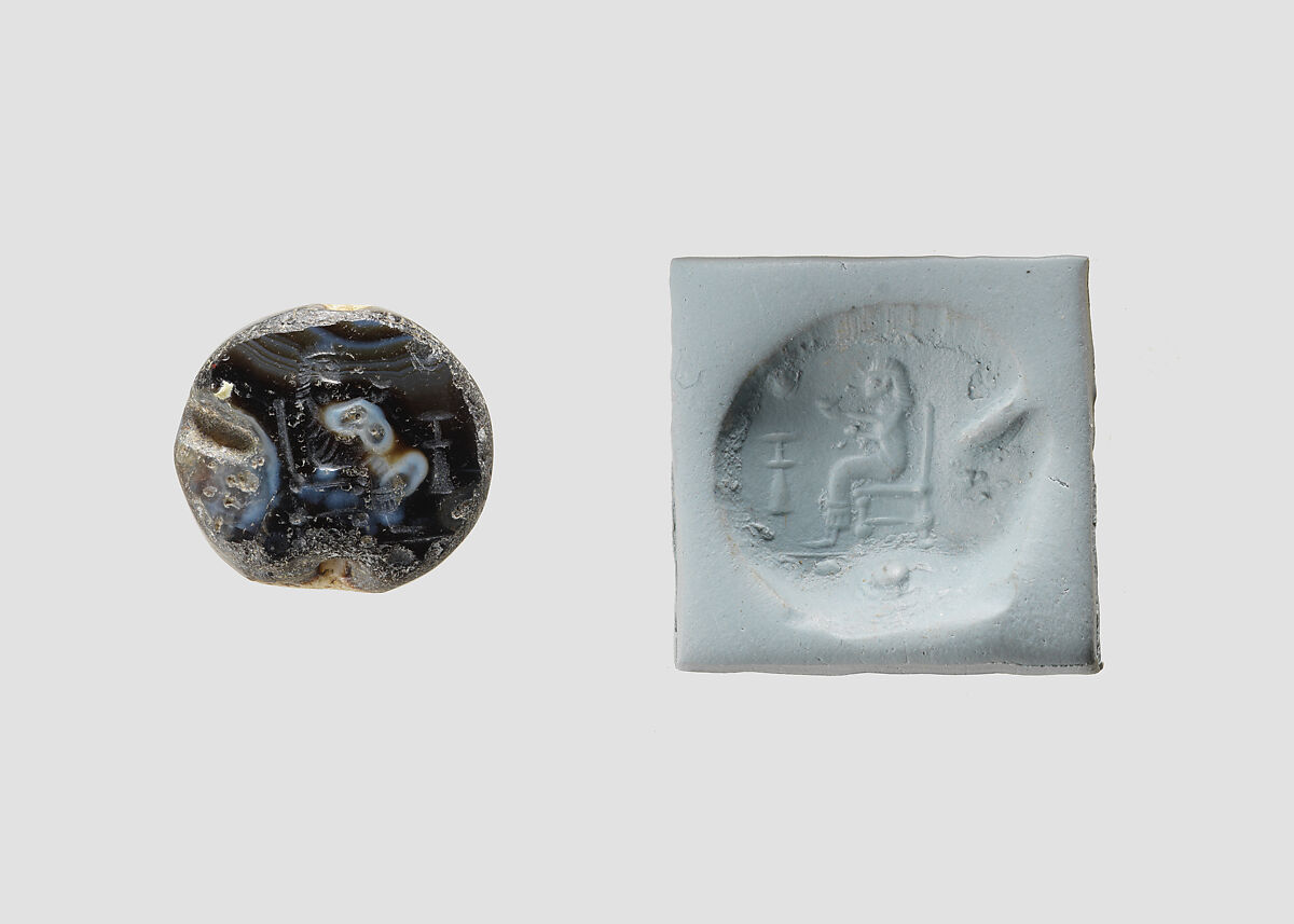 Drinking scenes appear on a handful of Achaemenid seals and seal impressions. Their appeal likely derives from the high status they imply, since elite Persians would be invited to dine with the king. The figure on this seal sits in high-backed chair that closely resembles the Persian king’s throne as depicted on the Apadana at Persepolis, further insinuating a royal connection.