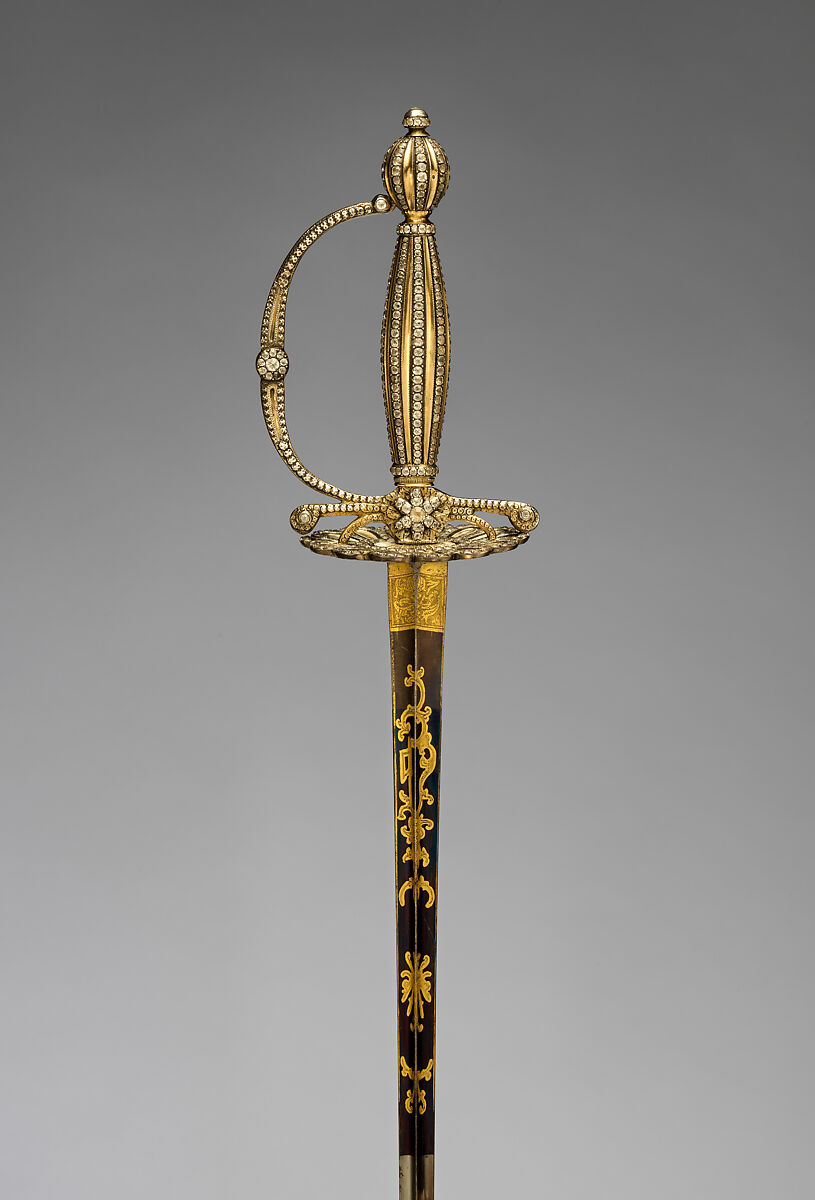 By the early seventeenth century, the rapier, a long slender thrusting sword, began to dominate as the gentleman’s weapon of choice. During the course of the century, however, as civilian fencing techniques became more specialized and refined, the rapier developed into a lighter, trimmed-down weapon known by about 1700 as the smallsword. Smallswords, often richly decorated, remained an integral part of a gentleman’s wardrobe until the wearing of swords in civilian settings went out of fashion at the end of the eighteenth century, at which time pistols were replacing swords as arms most frequently used in personal duels. The majority of smallsword hilts are made of silver or steel, but many also employ a wide variety of luxurious materials, such as gold, porcelain, and enamel. At their best, smallswords combine the crafts of swordsmith, cutler, and jeweler to create an elegant weapon that was also a wearable work of art.