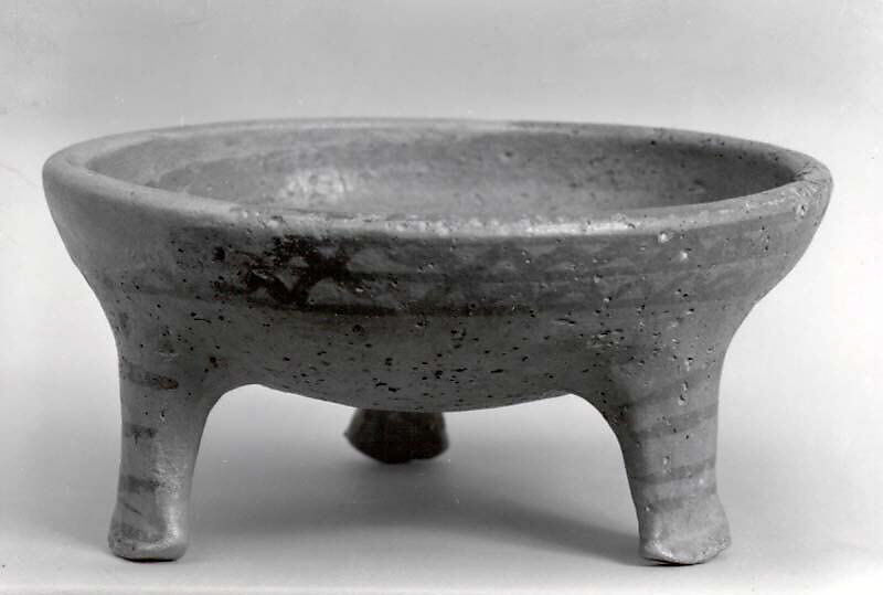 This round bowl stands on three legs. It is made of a buff clay, with painted brown geometric decoration. It was found in a grave at Kamterlan II, a mound in Luristan in the Zagros Mountains of western Iran. Although it had been a settlement in the late third millennium B.C., by the second millennium the site had become a cemetery. It is difficult to say what purpose this bowl served, or even to determine whether it was a special funerary item or an object of everyday use.