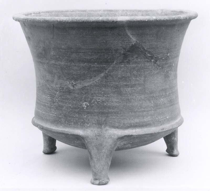 This cylindrical bowl has a rounded bottom and an outturned rim, and sits on three legs. It is made of buff clay. It was found in a grave at Kamterlan II, a mound in Luristan in the Zagros Mountains of western Iran. Although it had been a settlement in the late third millennium B.C., by the second millennium the site had become a cemetery. It is difficult to say what purpose this bowl served, or even to determine whether it was a special funerary item or an object of everyday use.