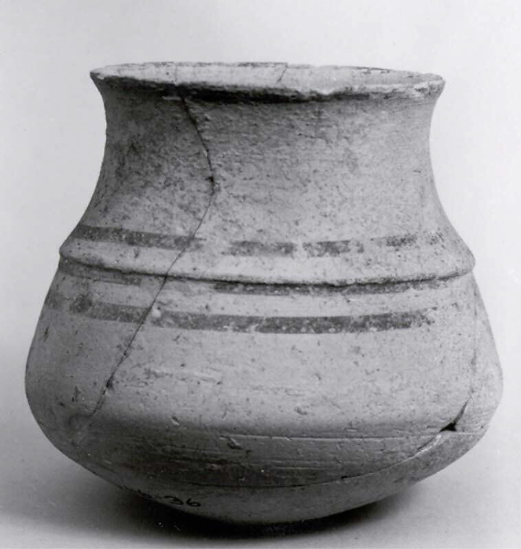 This jar has a flat base, bulging body, carinated shoulder and everted rim. It is made of a buff clay, with dark brown horizontal lines on the shoulder. It was found at Kamterlan II, a mound in Luristan in the Zagros Mountains of western Iran. Although it had been a settlement in the late third millennium B.C., by the second millennium the site had become a cemetery. The shape of the jar parallels that of bronze vessels, called ‘inkwells’ by archaeologists, which have been found in burials elsewhere in Luristan, as well as in Elam; in fact, the carinated shoulder is a feature of metalwork but not of pottery. Although their purpose is unclear, bronze inkwells attest to interaction and exchange between the elites of Elam and Luristan during the Bronze Age. This ceramic version suggests that its owner aspired to elite status.