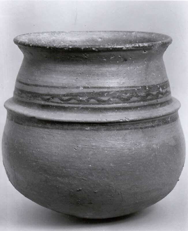 This jar has a globular body, a ring base, a ridge around its shoulder, a high neck and an everted rim. It is made of a buff clay, with dark brown horizontal lines on the shoulder. It was found in a grave at Kamterlan II, a mound in Luristan in the Zagros Mountains of western Iran. Although it had been a settlement in the late third millennium B.C., by the second millennium the site had become a cemetery. It is difficult to say what purpose this bowl served, or even to determine whether it was a special funerary item or an object of everyday use. The raised ridge at the shoulder might suggest that the shape of this vessel imitates a metal prototype.