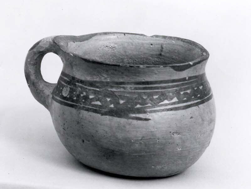 This cup has a globular body, a flat base, an everted rim and a loop handle; it resembles a modern coffee mug. It is made of a buff clay, with dark brown lines on the neck and handle. It was found in a grave at Kamterlan II, a mound in Luristan in the Zagros Mountains of western Iran. Although it had been a settlement in the late third millennium B.C., by the second millennium the site had become a cemetery. The handle suggests that this cup was a drinking vessel, but it is impossible to determine what was drunk from it, or whether it was a special funerary item or an object of everyday use.