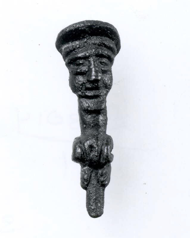 This is a cast pin in the form of a male figure, as suggested by the slight bulge at the front of his thick neck. The figure has a very large head, with a prominent nose, puffy cheeks, pointed chin, and thick brow. He wears a beret over his wavy hair. He has a tiny, squatting body, and his feet rest on either side of the top of the pin’s shaft, much of which no longer survives. The figure itself is made of copper, while the shaft of the pin is bronze.