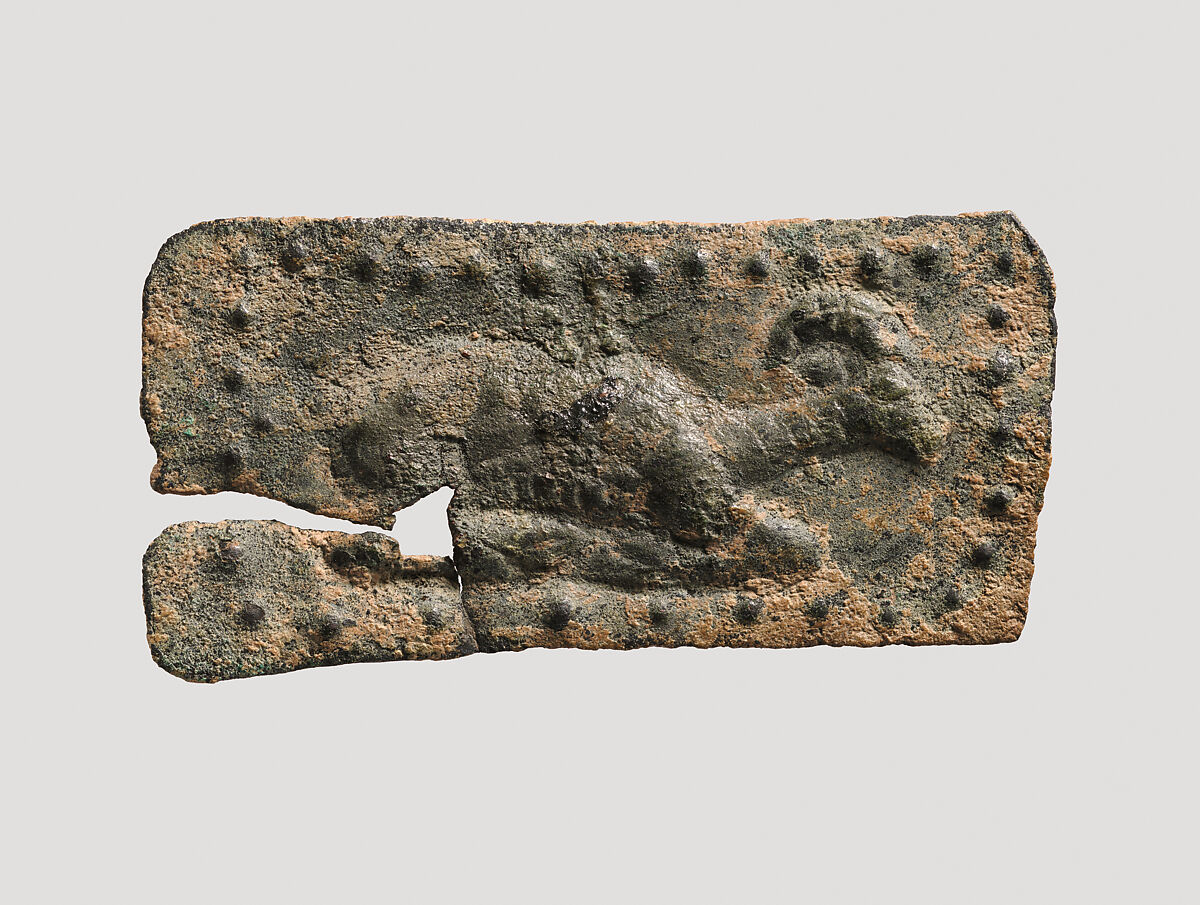 This bronze plaque has an image of a horned recumbent animal, possibly an ibex. The image is surrounded by a border of raised dots. The plaque was hammered from a single sheet of bronze. It has no attachment holes, making it unclear what purpose it served. Possibly it was made as a votive.
