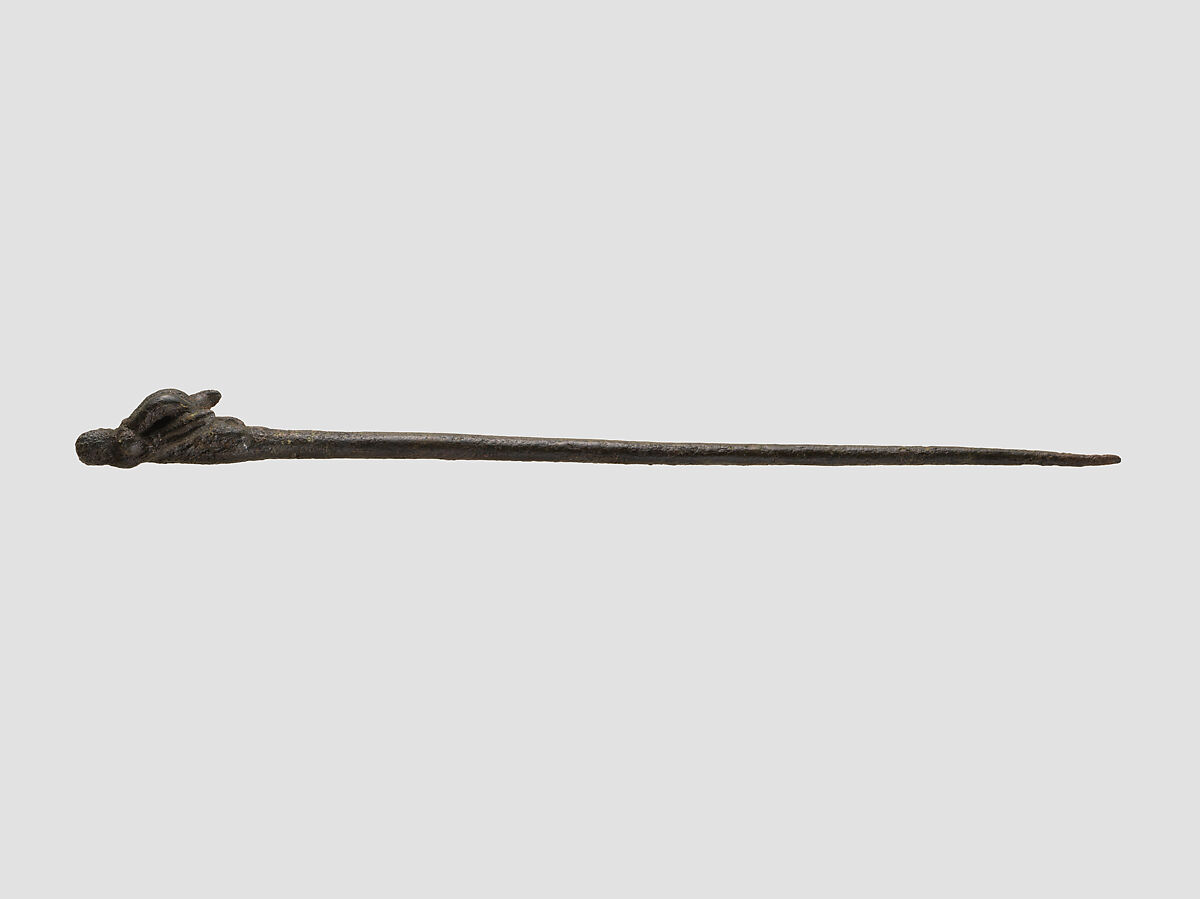 This cast bronze pin has a head in the form of a horned animal, possibly an antelope, with a tubular snout and pointed ears. It was excavated at Surkh Dum, a settlement site in Luristan in the Zagros Mountains of western Iran. It was found in a structure interpreted as a sanctuary and was thus probably an offering to a god. Such pins were probably used to fasten clothing and as objects of adornment in their own right. Many have been attributed to Luristan, but this is one of the few examples from an archaeological excavation.