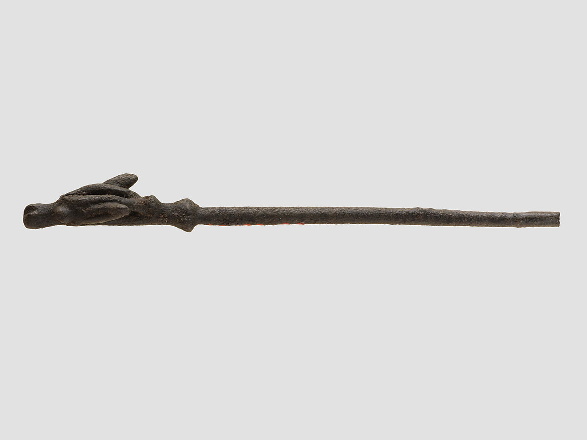 This cast bronze pin has a head in the form of a horned animal, possibly an antelope, with a tubular snout and pointed ears. It was excavated at Surkh Dum, a settlement site in Luristan in the Zagros Mountains of western Iran. It was found in a structure interpreted as a sanctuary and was thus probably an offering to a god. Such pins were probably used to fasten clothing and as objects of adornment in their own right. Many have been attributed to Luristan, but this is one of the few examples from an archaeological excavation.