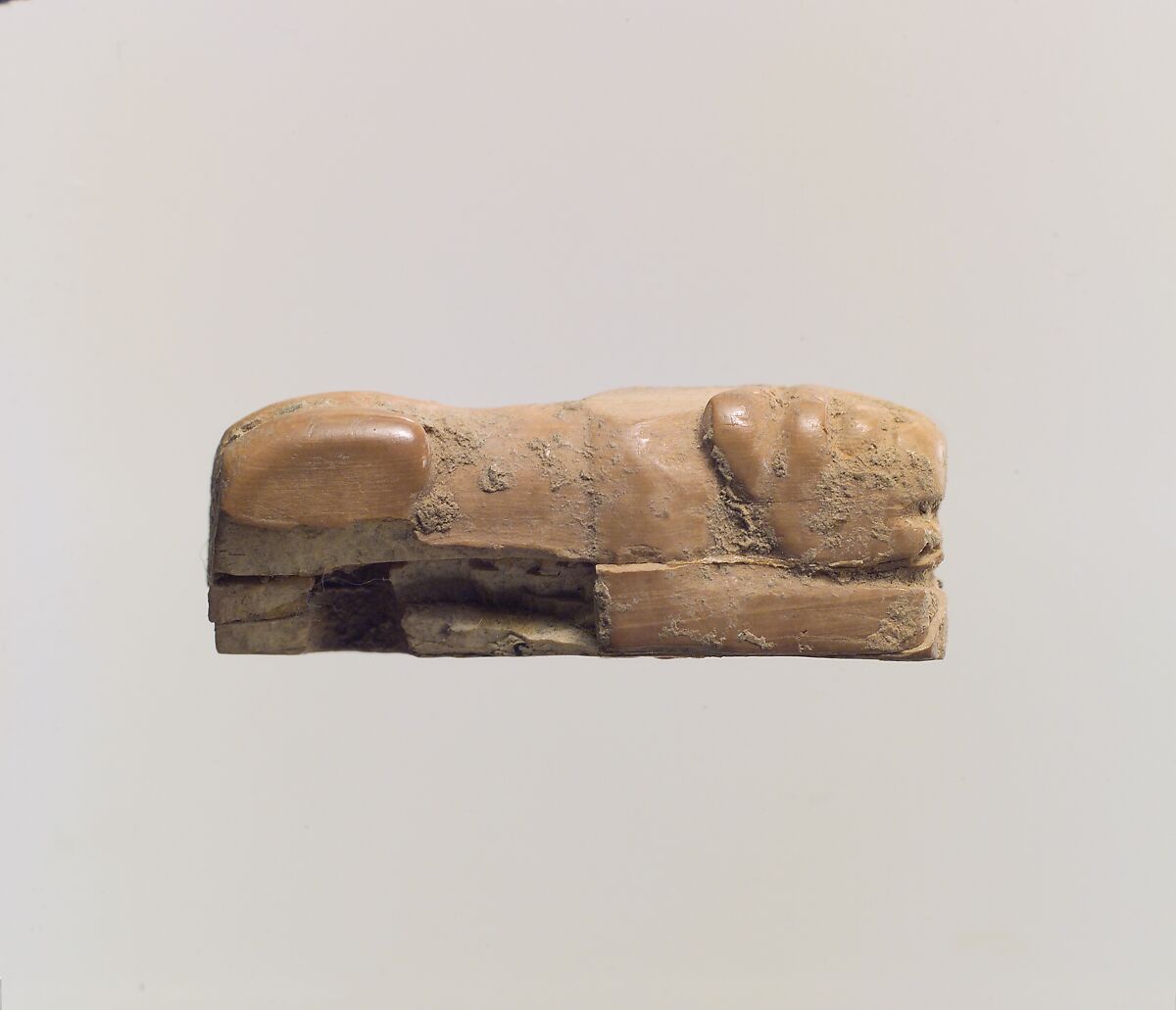 This is a small crouching ivory lion. The lion has large round eyes, triangular ears and an open mouth. Its shoulders and hindquarters are rounded. A large section of the right hindquarter is now missing, and the entire left side of the lion is quite worn. The lion rests on a flat base with two holes. Presumably it was originally attached to something, but it is impossible to say what at this point. Possibly it was the handle for an ivory container of some kind.