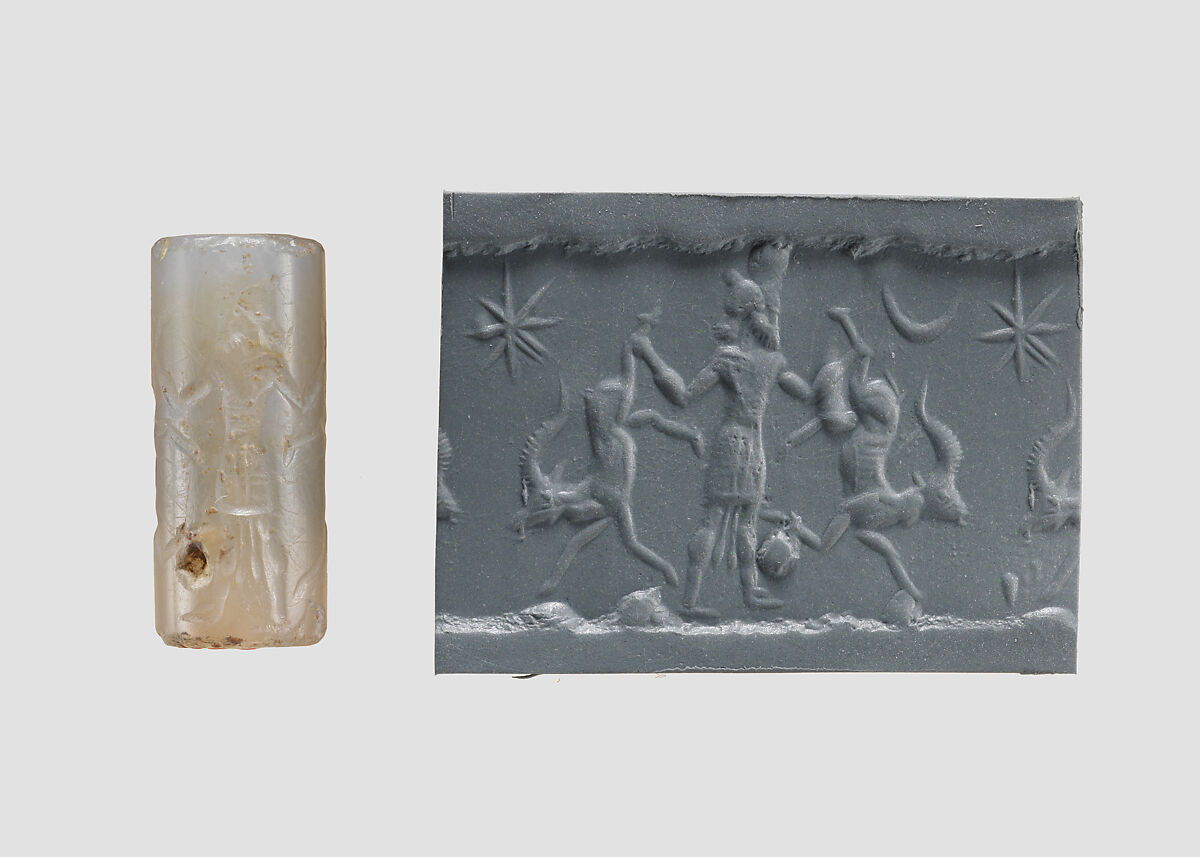 The modern impression of the seal is shown so that the entire design can be seen. This seal shows a male figure grasping two long-horned animals, each suspended by one rear leg. He wears a short belted garment and a helmet surmounted by a lobe-like projection. In the field are an eight-pointed star and a crescent moon.